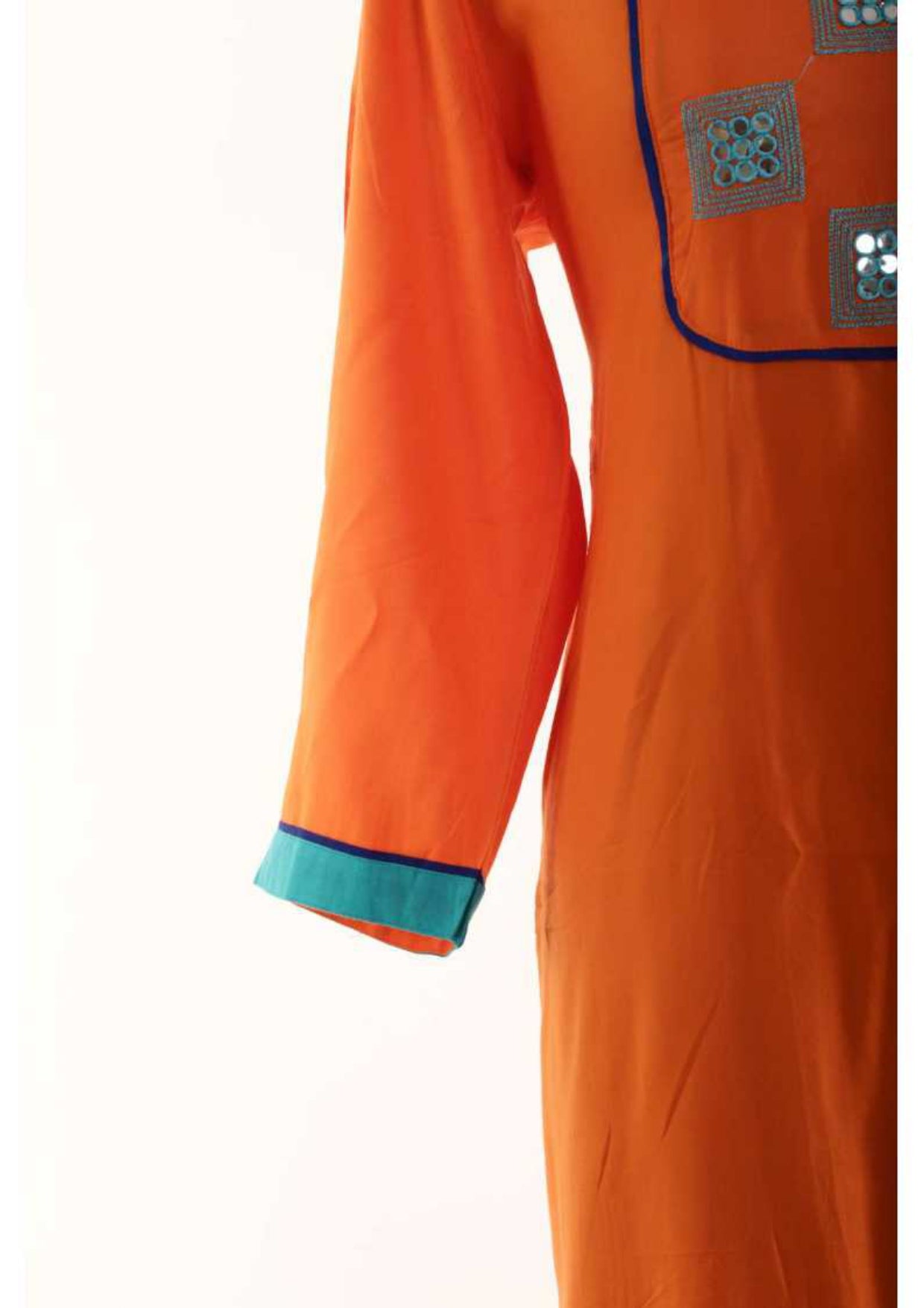 Discover the dazzling charm of the Aabeli Kurta, an elegant orange dress with shimmering mirrors adorning the bodice and neckline. It is a comfortable, elegant kurta that is fitted to accentuate your form. Well-made from high-quality materials, it's adorable and endearing. The Aabeli Kurta permits unhindered mobility and a healthy vibe throughout the day. Its three-quarter sleeves and distinctive neckline enhance its allure. This kurta will give an element of "adorable" to anything you wear.
