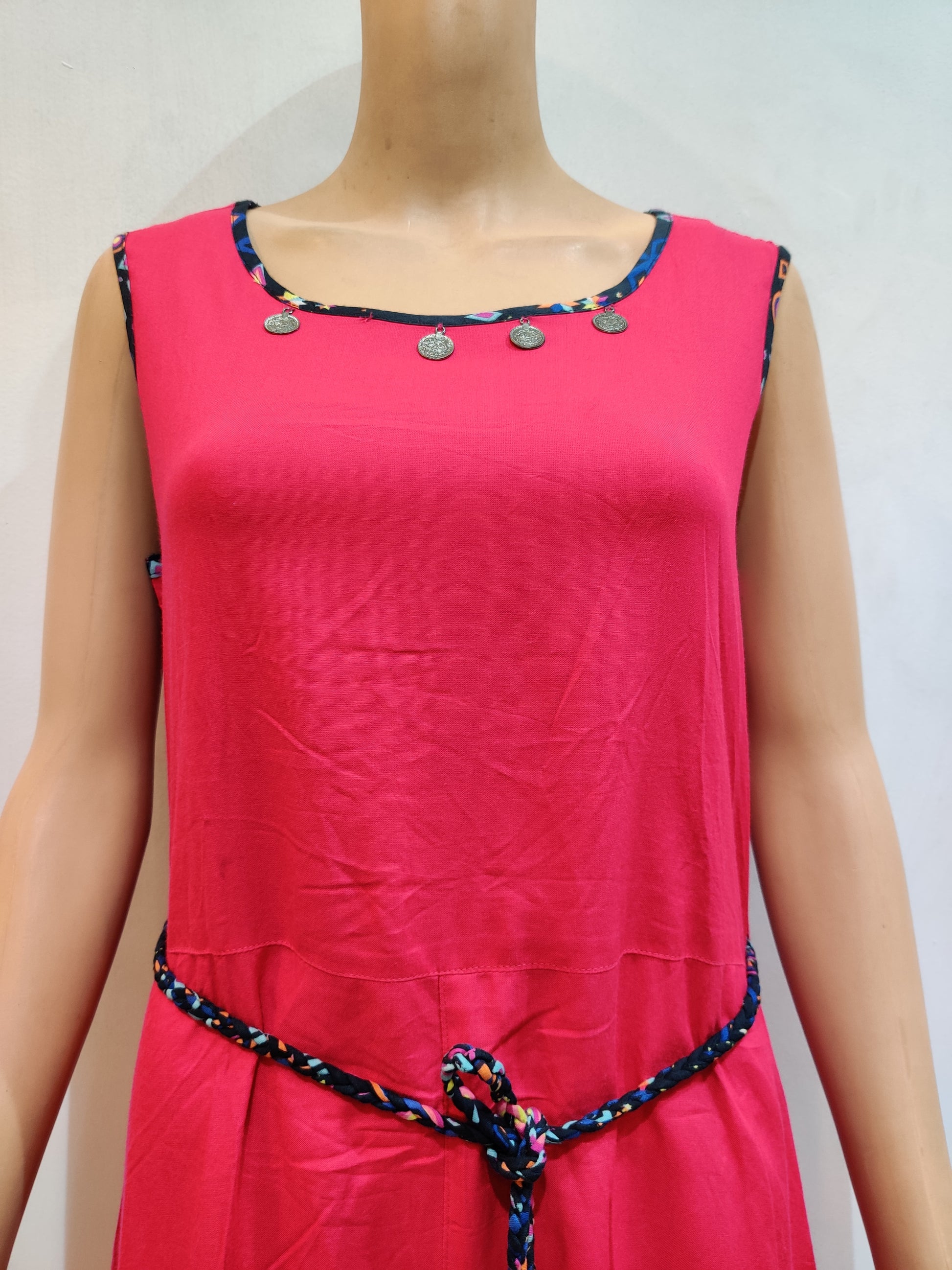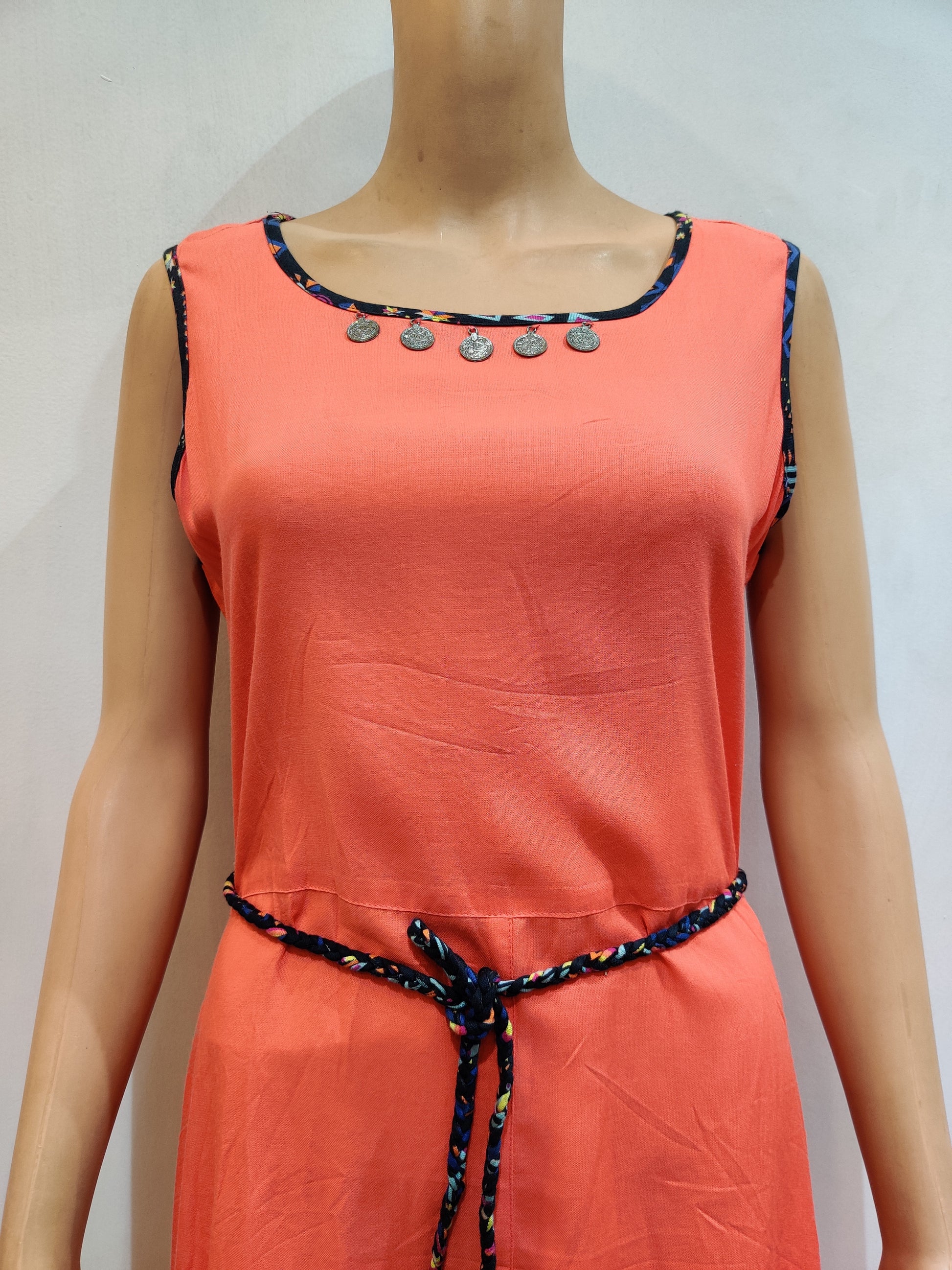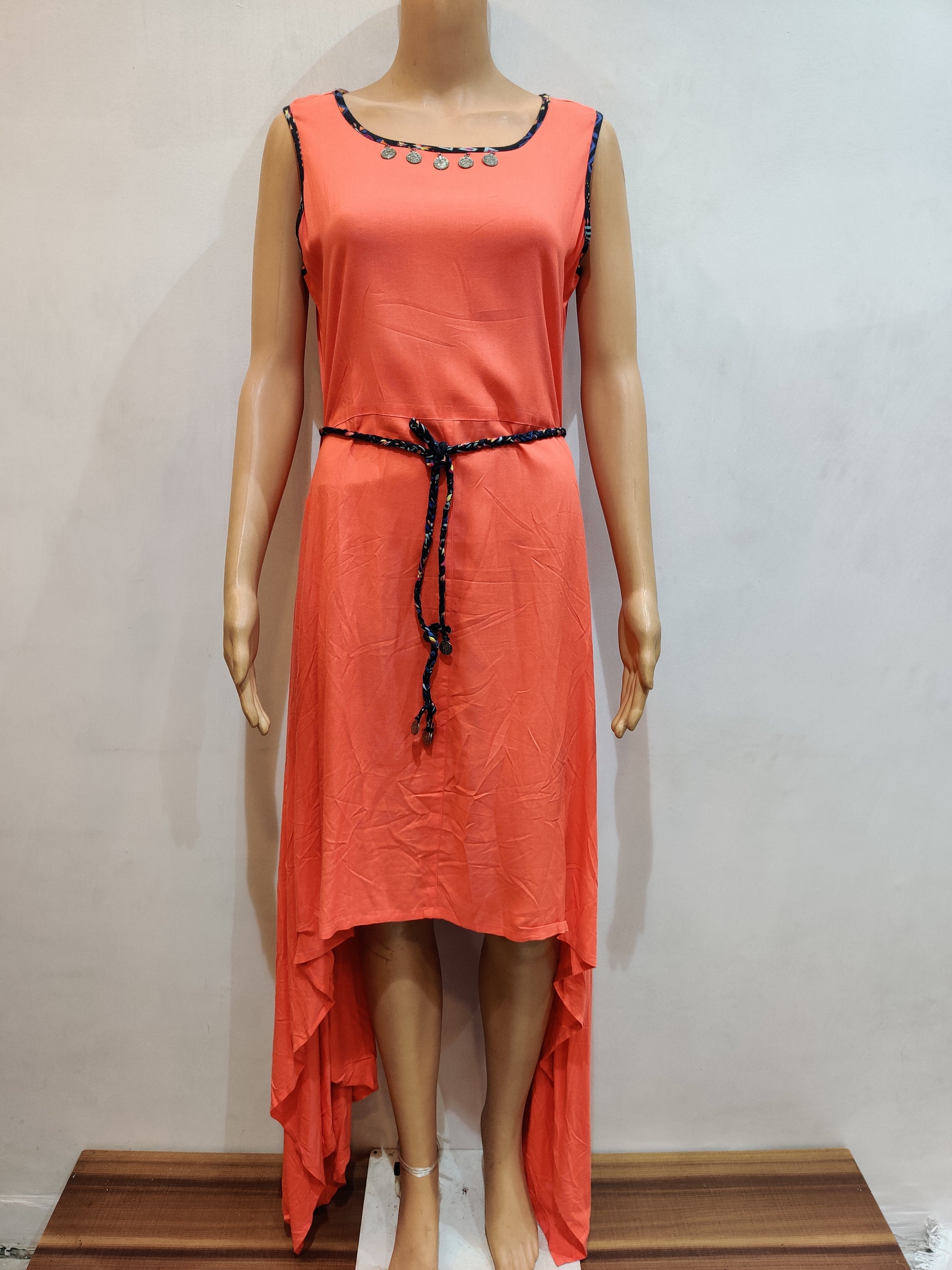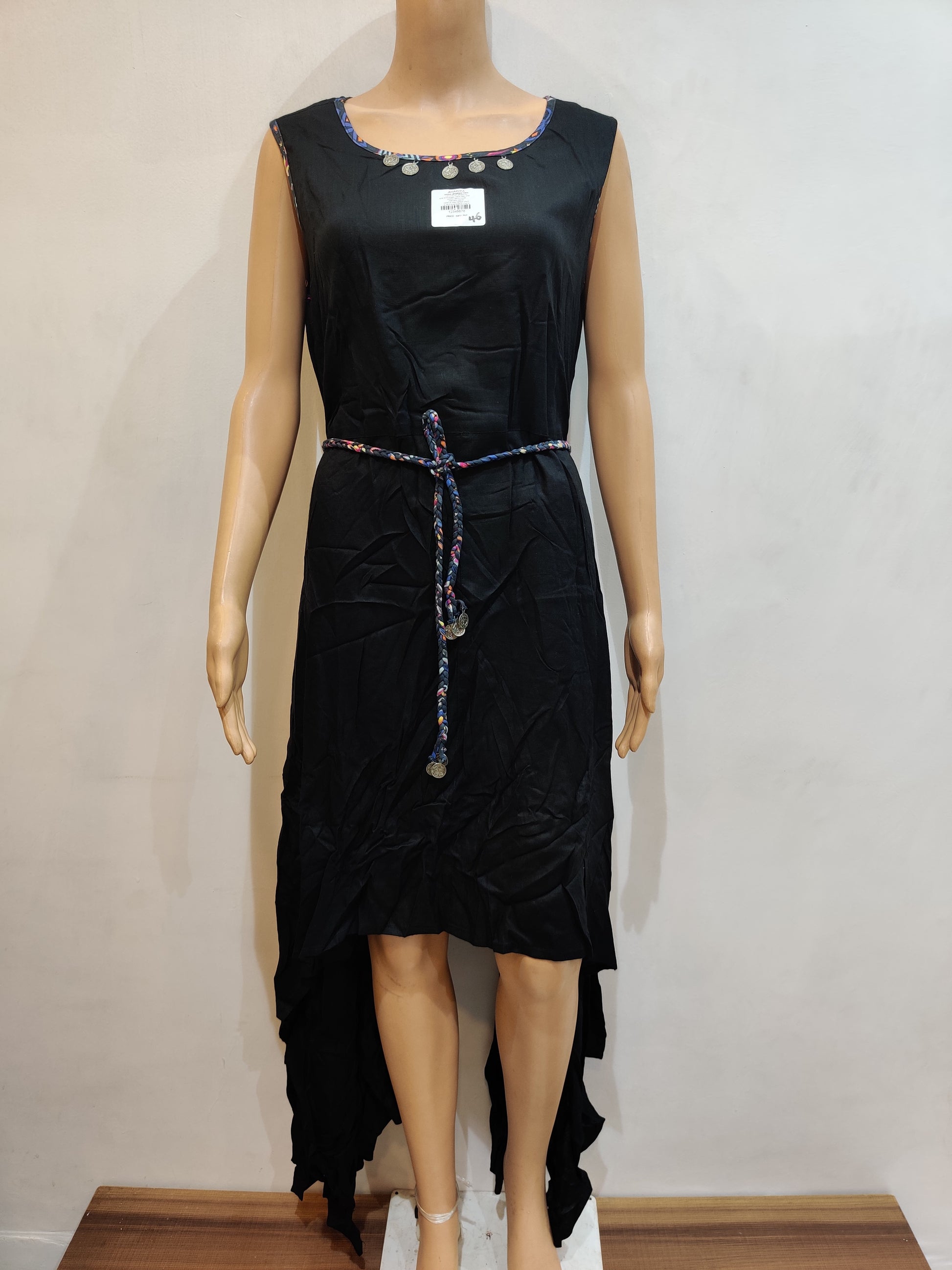 The Plumeria dress is a sight to behold as it comes in various hues like black, salmon pink, and peach. There is no secondary shade, making the color and design the focal point, but there is a patterned design on the upper part with cute adornments. It has a boat neckline adorned with detailed details and a glittery belt to accentuate its beauty further. The dress has a sleeveless design, perfect for a comfortable yet stylish look. The dress has a unique asymmetric cut along the bottom.