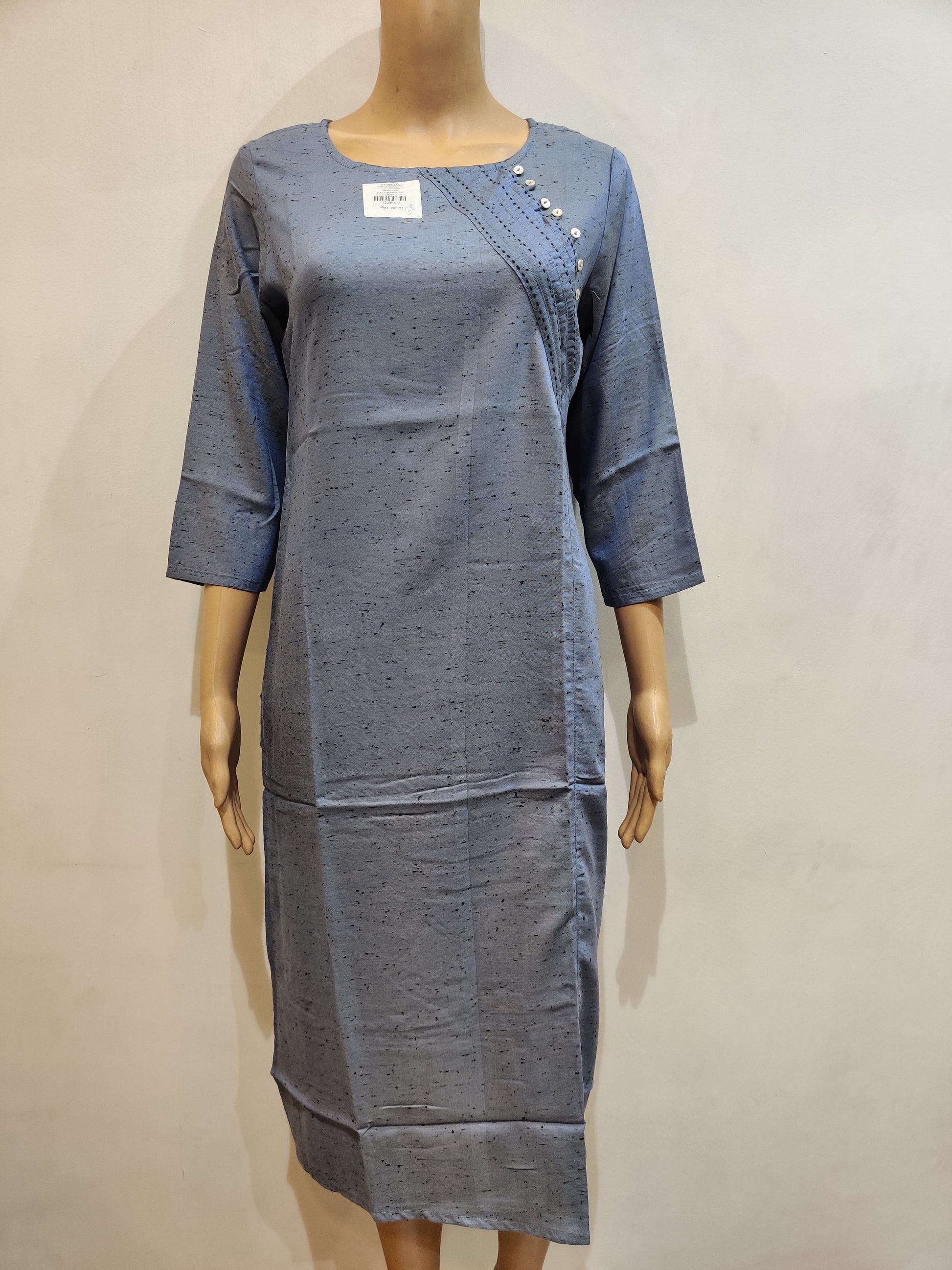 Women pure cotton printed kurti. Three quarter sleeves with designable round neckline and printed regular pattern. The entire body framework is machine stitched. This straight cut kurti has another colour. Perfect for everyday wear.