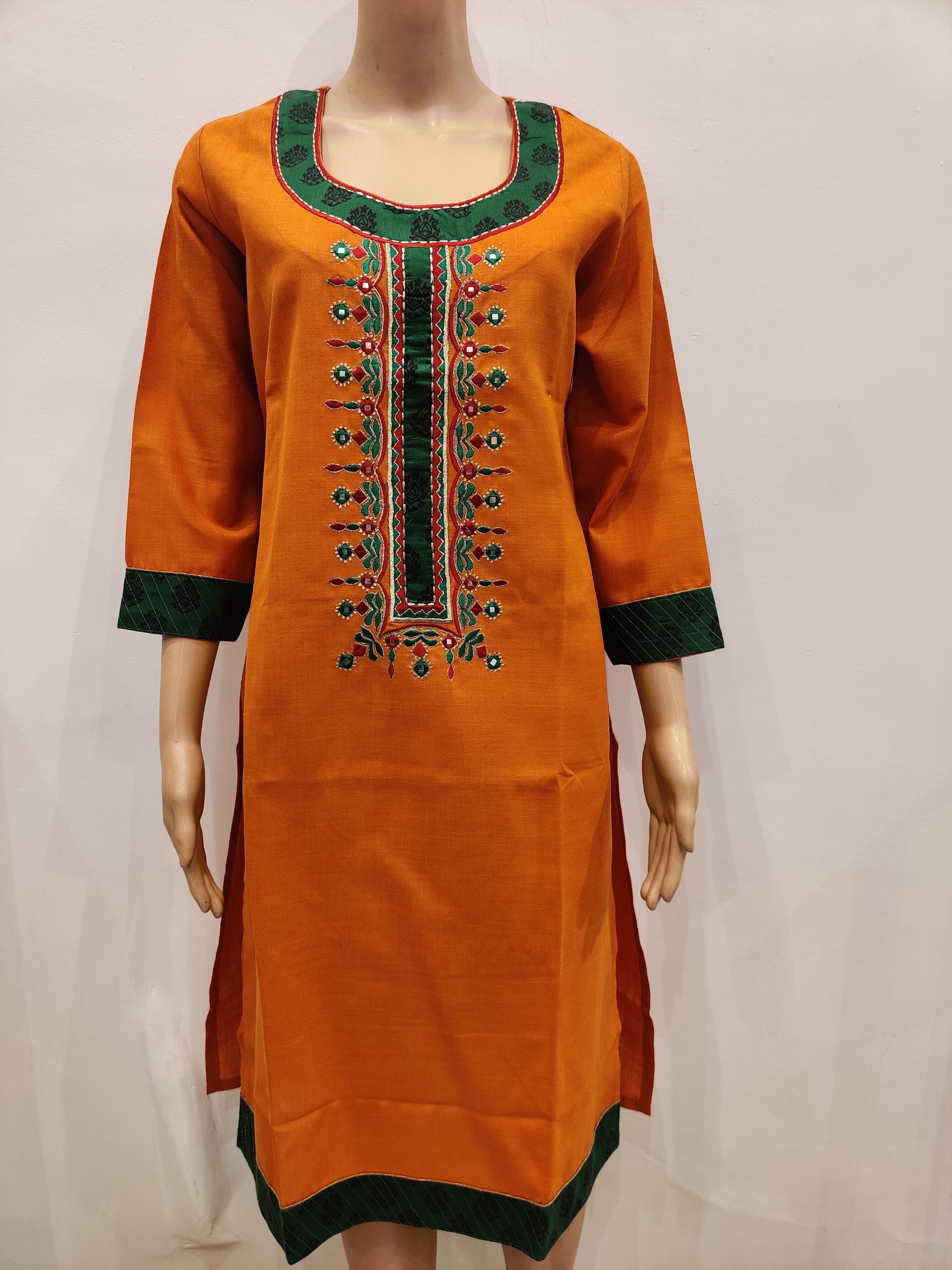 - The kurti boasts an intricate design with detailed hand embroidery on the front.