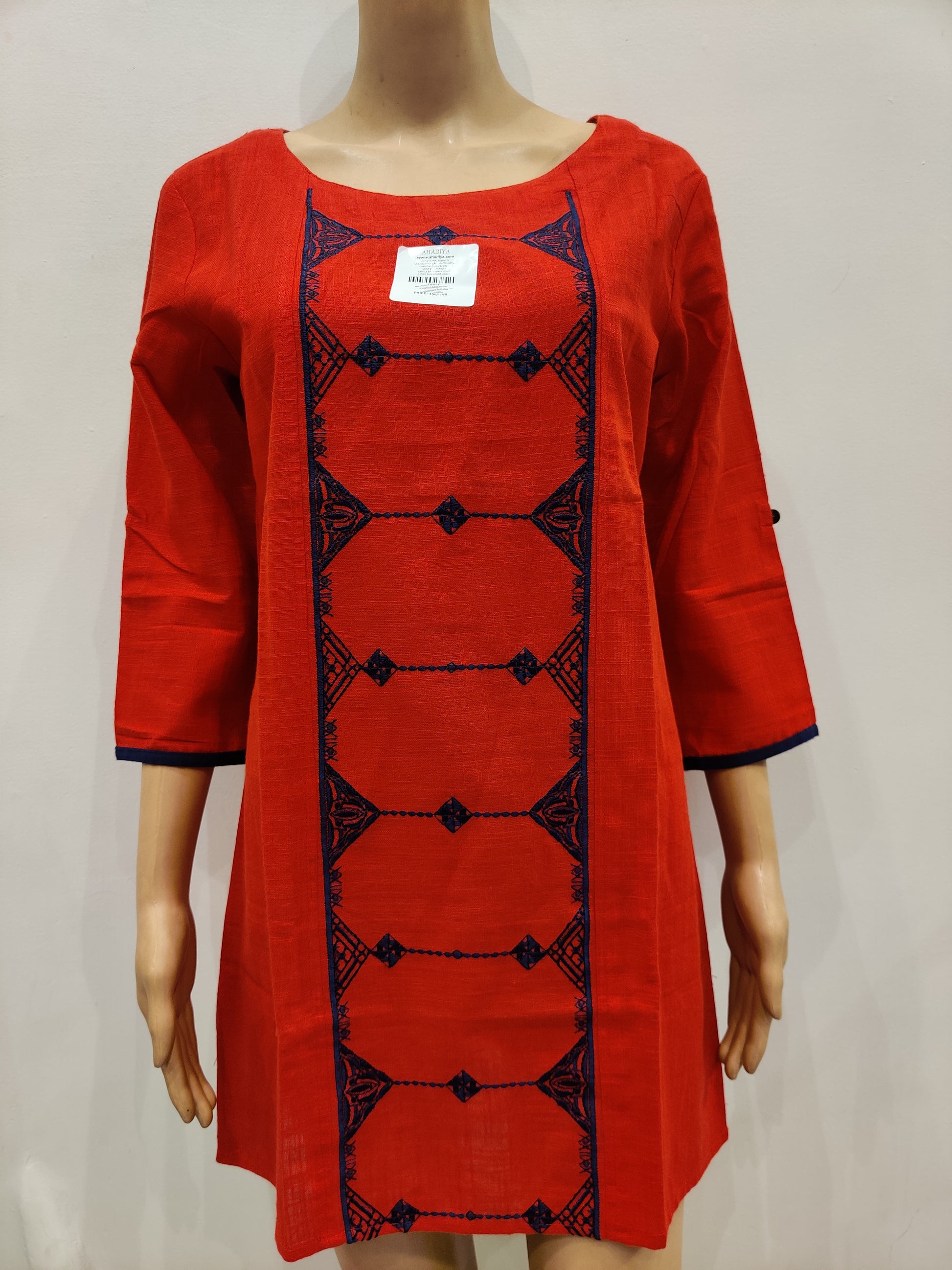 The Anemone kurta is a sight to behold, created from the finest vivid red Linen Cotton that grabs everyone's attention. The intricate design on the front in blue with accents on the long sleeves provide contrast to the overall look.