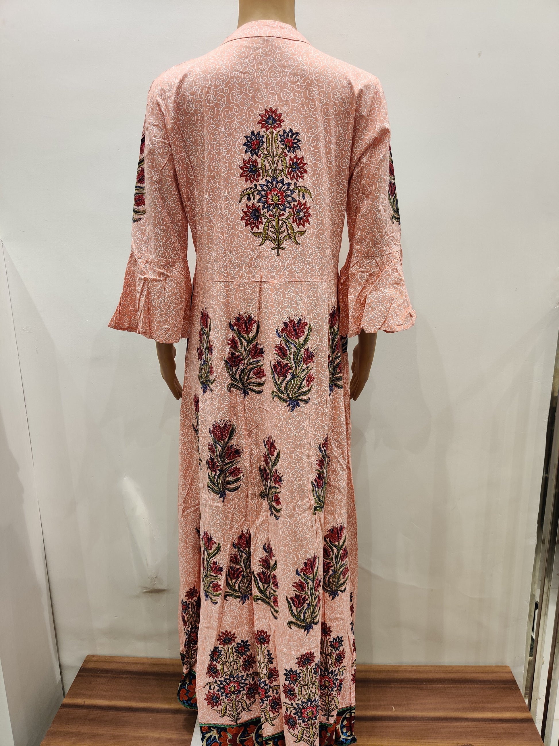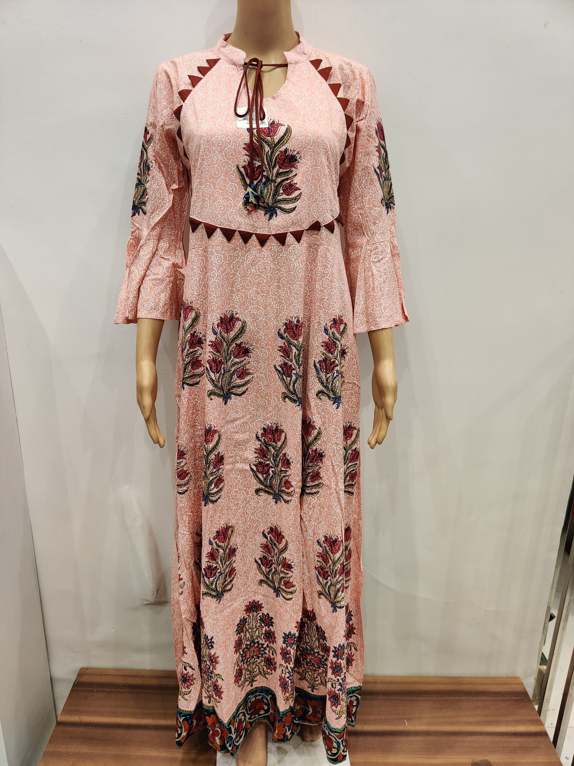 This exquisite gown is a harmonious blend of comfort and style, meticulously crafted from a luxurious fabric that graces the skin with softness. The material is woven with precision, ensuring both durability and a gentle touch. Adorned with an intricate pattern, the gown exhibits a series of detailed motifs that cascade gracefully along the length of the dress, offering a visual appeal that is both classic and contemporary. Its flowing silhouette and delicate detailing make it a perfect choice for formal occasions or special events.