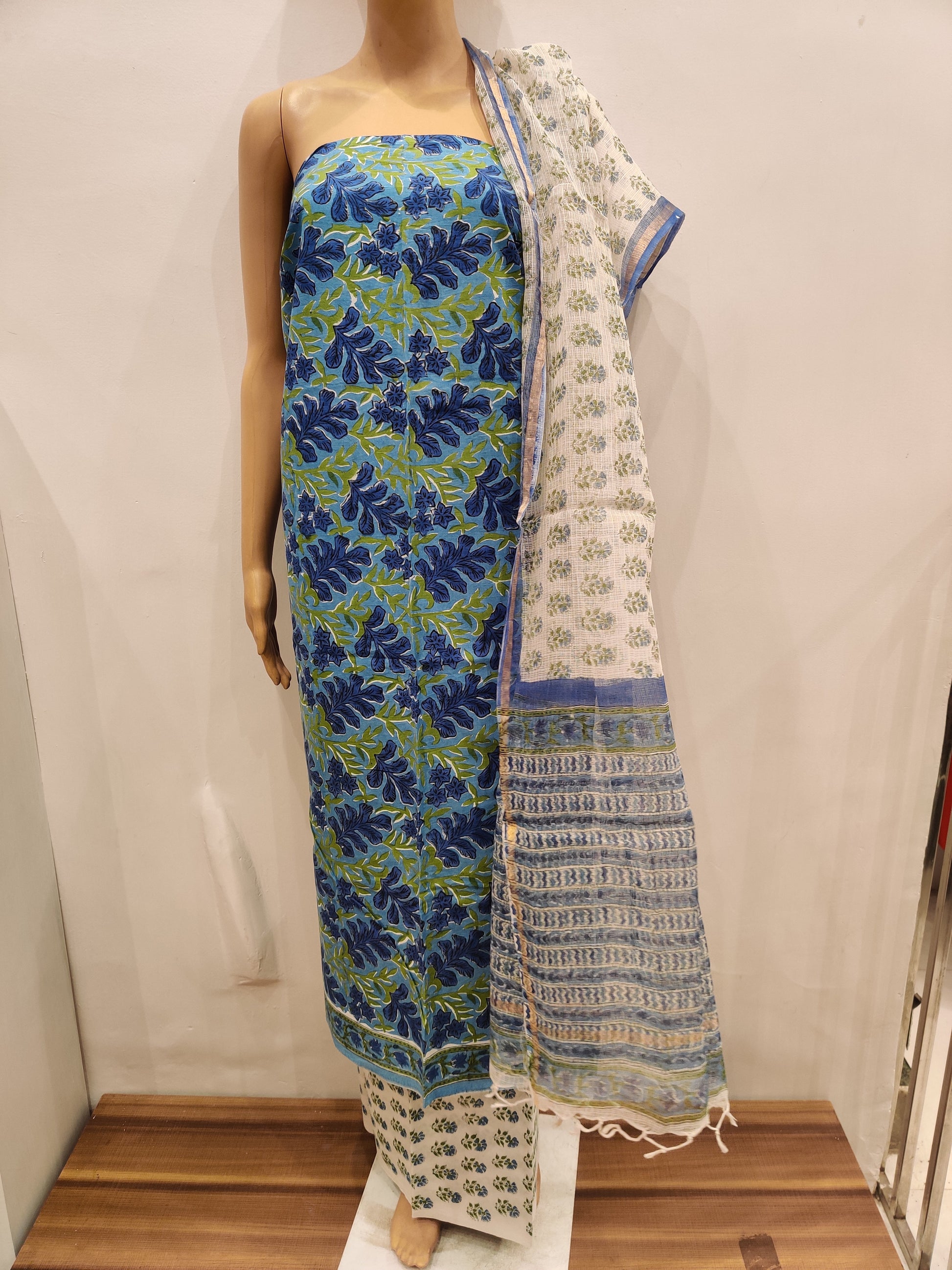 This unstitched material is made from a lightweight, breathable cotton fabric. The fabric features a vibrant blue and green abstract floral or leaf pattern printed all over. The accompanying sheer white fabric, likely meant for a dupatta or shawl, has a delicate lace or net detailing along the edges. I would describe the overall set as perfect for warm weather with its airy, summery feel and eye-catching yet elegant prints suitable for both casual and festive ethnic ensembles.