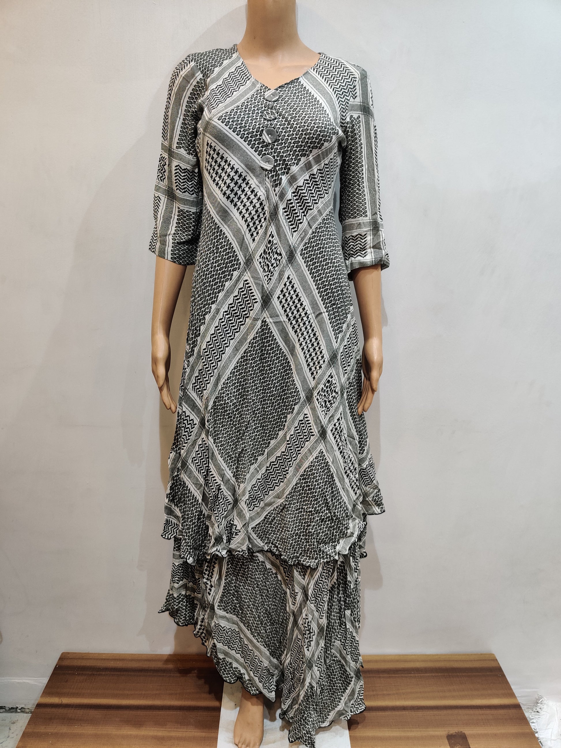 Step into a world of timeless elegance with our charcoal-hued gown, a true masterpiece of design and craftsmanship. The fabric is a luxurious blend, meticulously woven to provide both comfort and a sophisticated style. It features a rich charcoal color, enhanced by the shimmer of intricate silver patterns that cascade gracefully from the bodice to the hem. This gown is not just a piece of clothing; it’s an experience of opulence and grandeur, perfect for making a statement at any upscale event. Its exquisite design and attention to detail promise to make you the epitome of refined fashion.