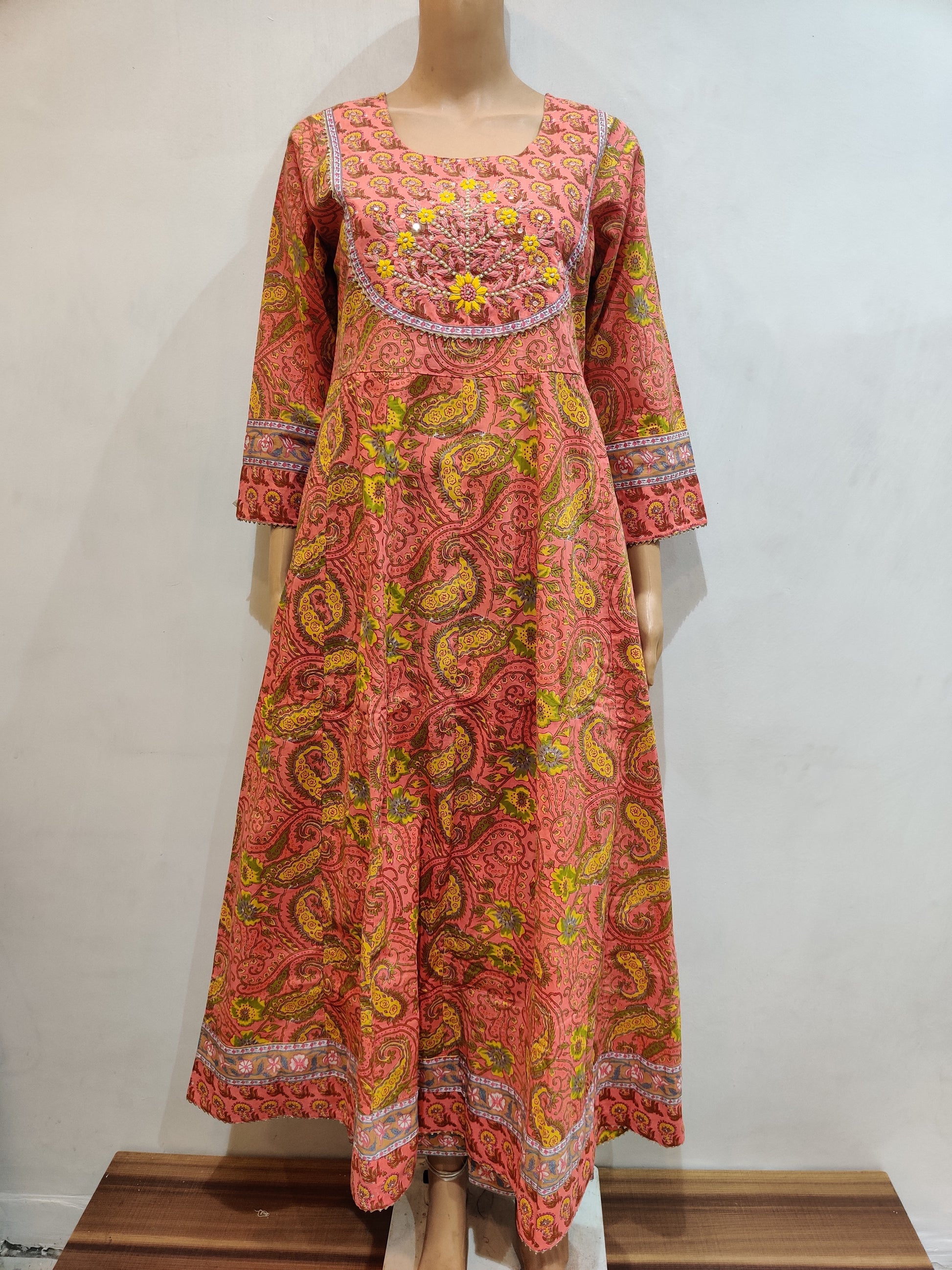 This elegant gown is crafted from a lightweight, sheer fabric like chiffon or georgette. The intricate floral patterns adorning the gown seem to be skillfully rendered using traditional block printing or hand-dyeing techniques prevalent in regions known for their textile artistry.