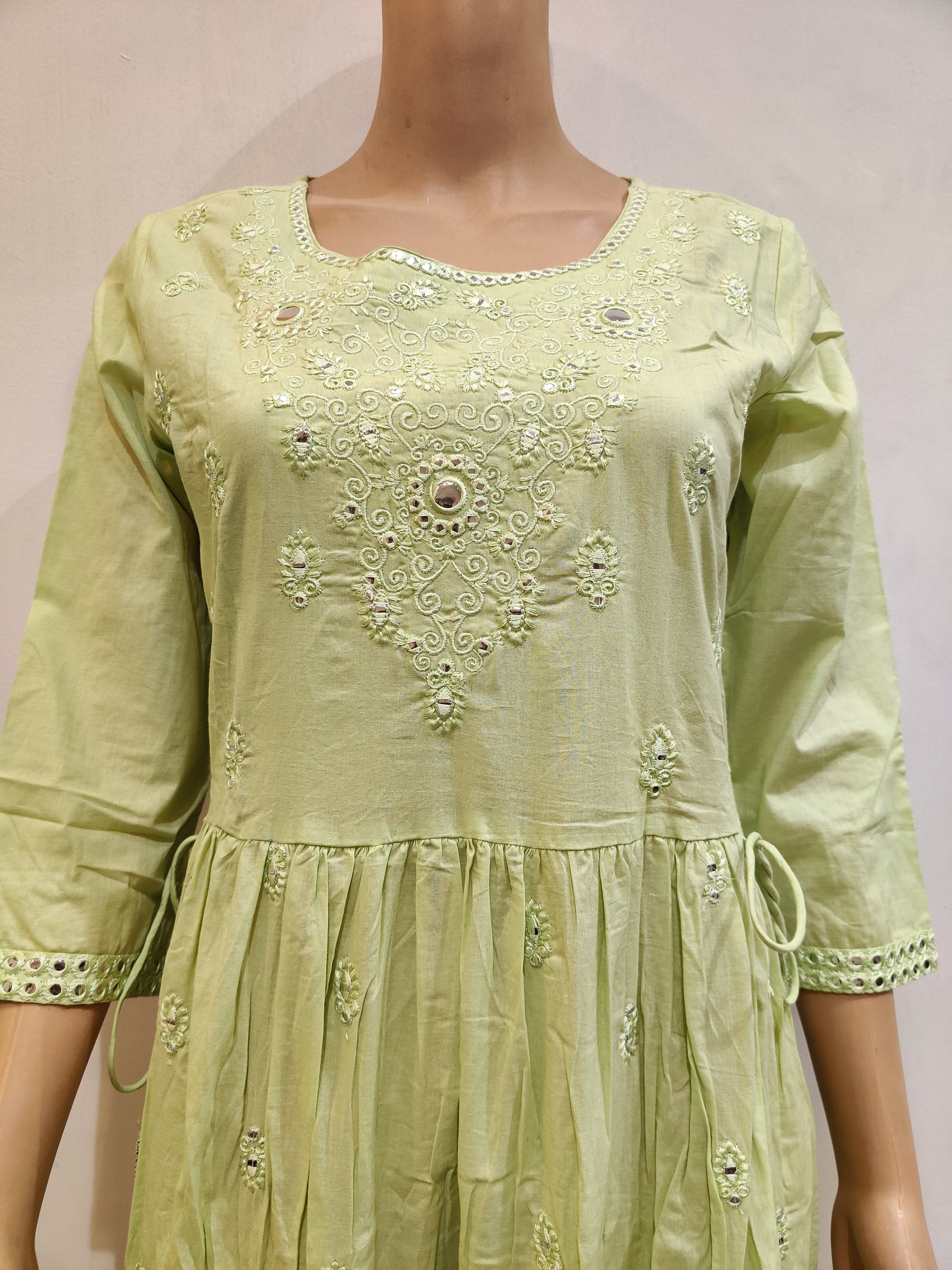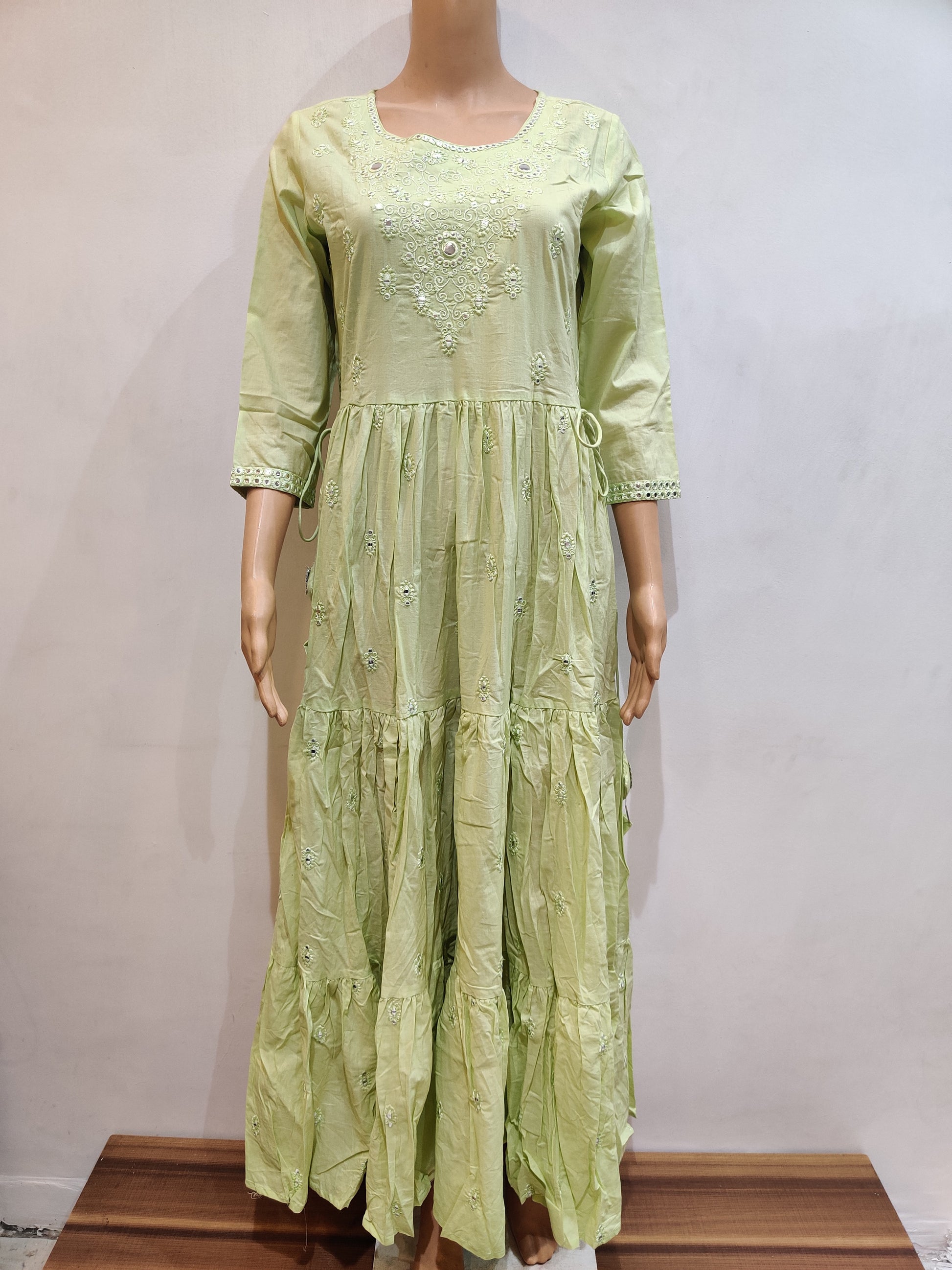 This gown exudes an ethereal charm with its delicate sage green hue and flowy, billowing silhouette. The fabric appears to be a lightweight cotton or cotton blend, carefully woven with intricate floral embroidery or lace detailing that adds a romantic, vintage-inspired touch.