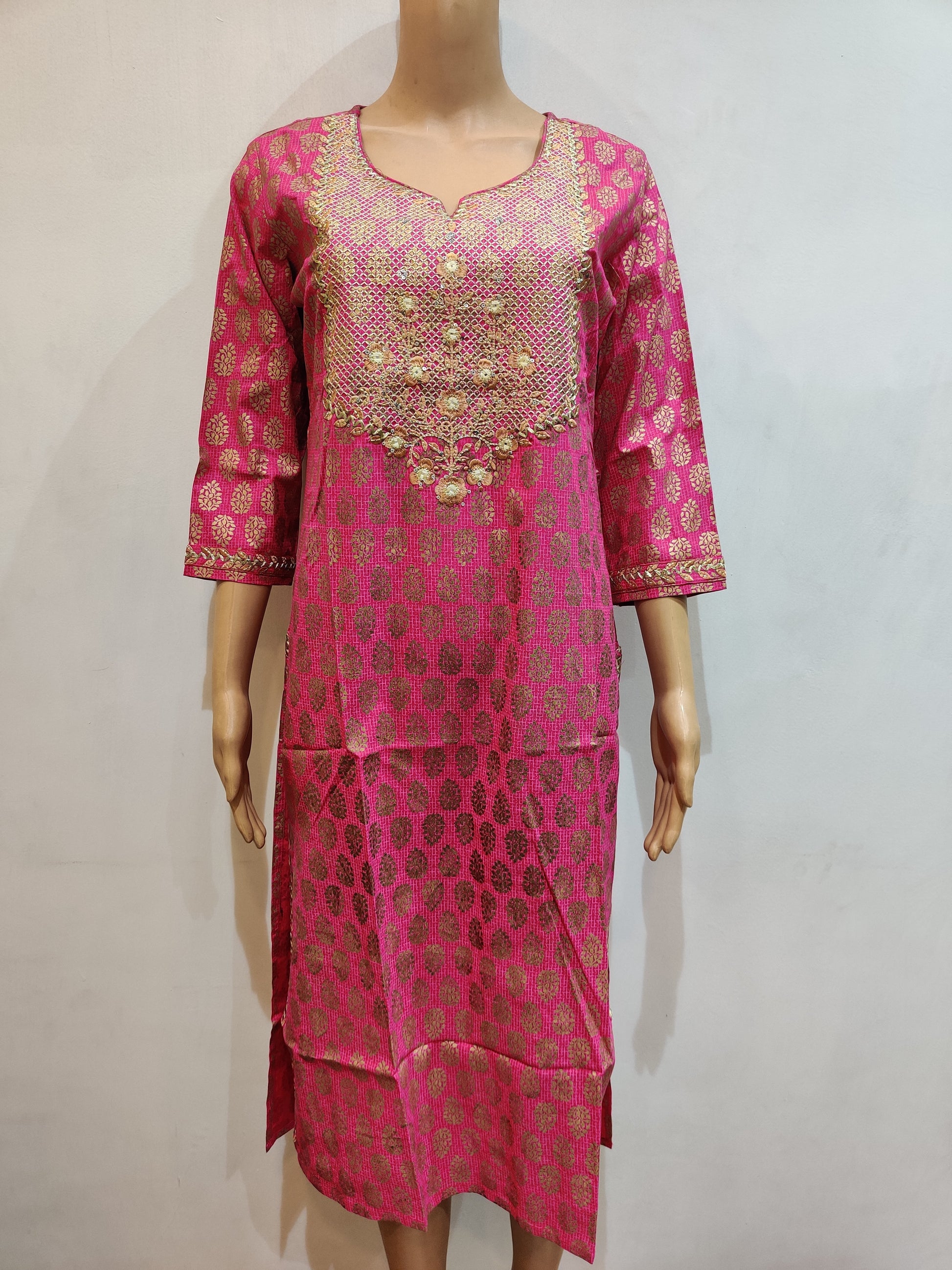 The lightweight, flowing material drapes beautifully, providing a comfortable and flattering fit. The color palette and intricate patterning evoke a sense of timeless elegance, making this kurti a versatile choice for both casual and formal occasions. The blend of high-quality fabrics and skilled craftsmanship results in a garment that exudes sophistication and cultural flair.