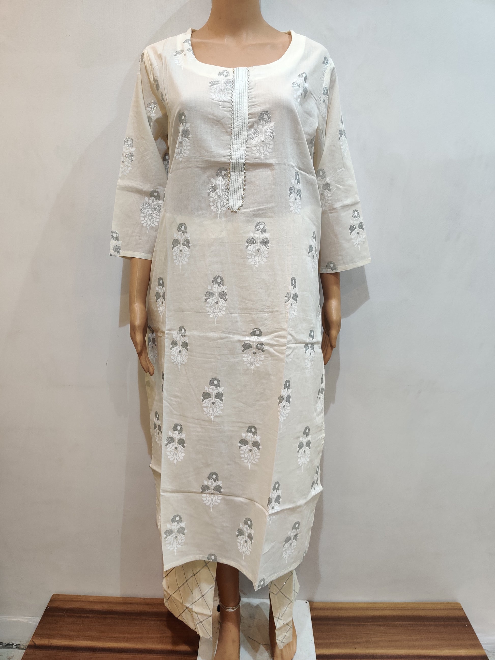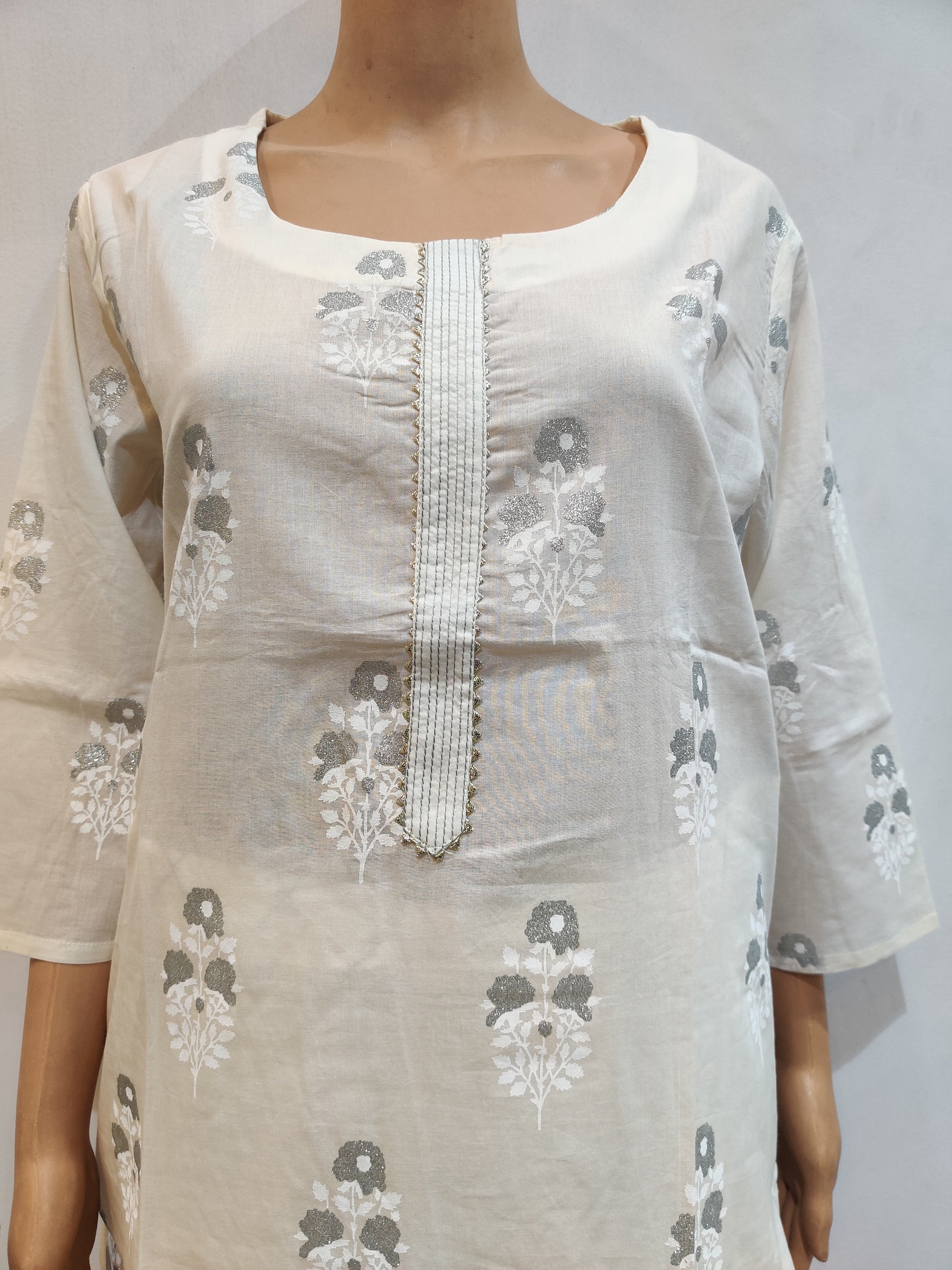 The kurti is made of a lightweight, breathable cotton fabric. It has an understated yet elegant pattern of delicate white floral motifs scattered across its off-white colored surface, lending a subtle charm. The kurti has three-quarter length sleeves and a straight, relaxed fit silhouette that falls below the knees, making it a comfortable and versatile choice for various casual or semi-formal occasions.