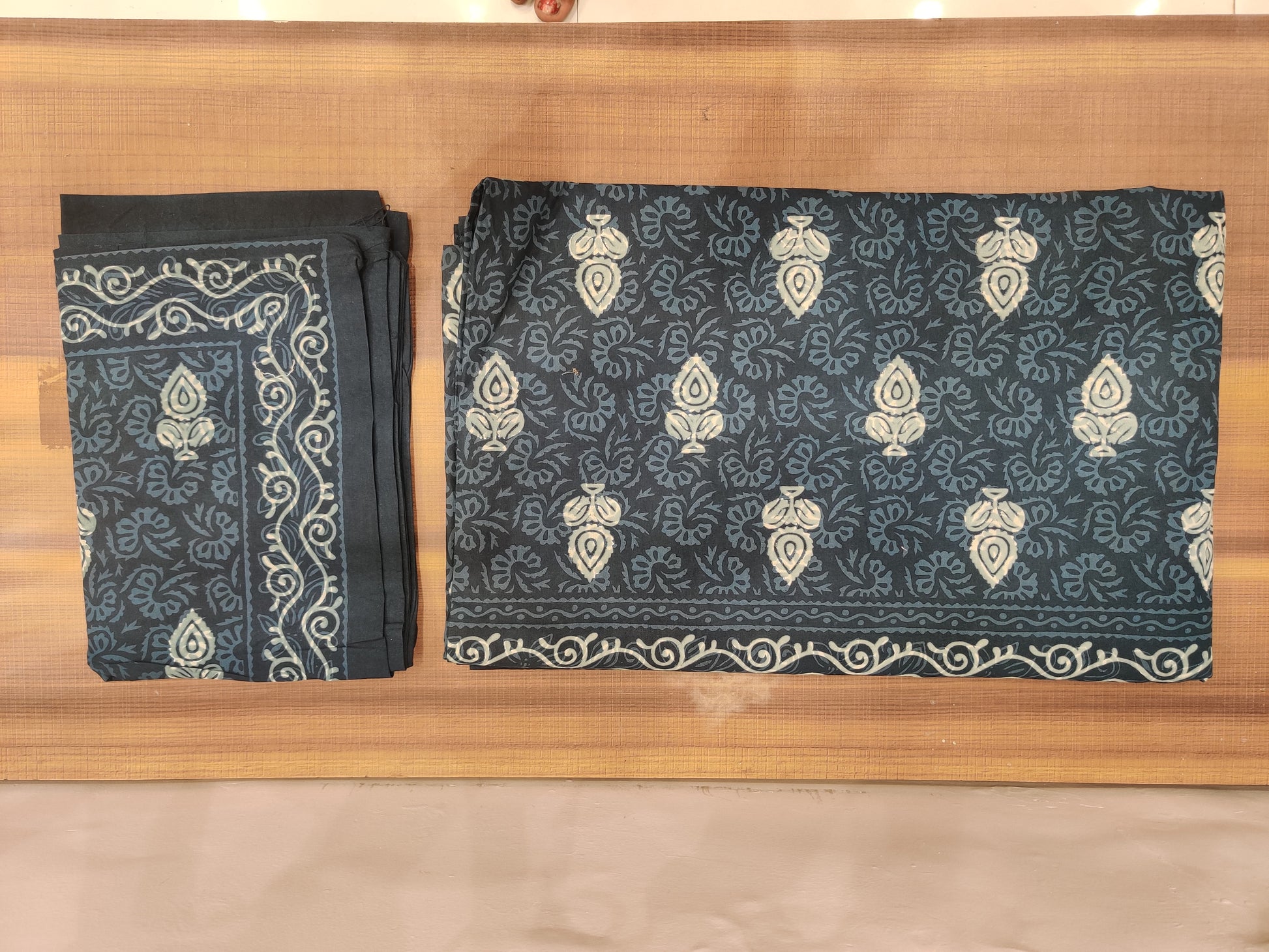 Indulge in the luxurious embrace of our exquisite bedsheet set. Crafted with meticulous precision, each piece is woven from premium fabric, ensuring a soft, smooth texture that caresses the skin while promising durability. The rich navy blue hue, imbued with a subtle yet captivating vegetable print, evokes a sense of serene beauty. Whether you’re dressing up your bedroom or adding a touch of elegance to a guest room, this bedsheet set seamlessly blends comfort and style.