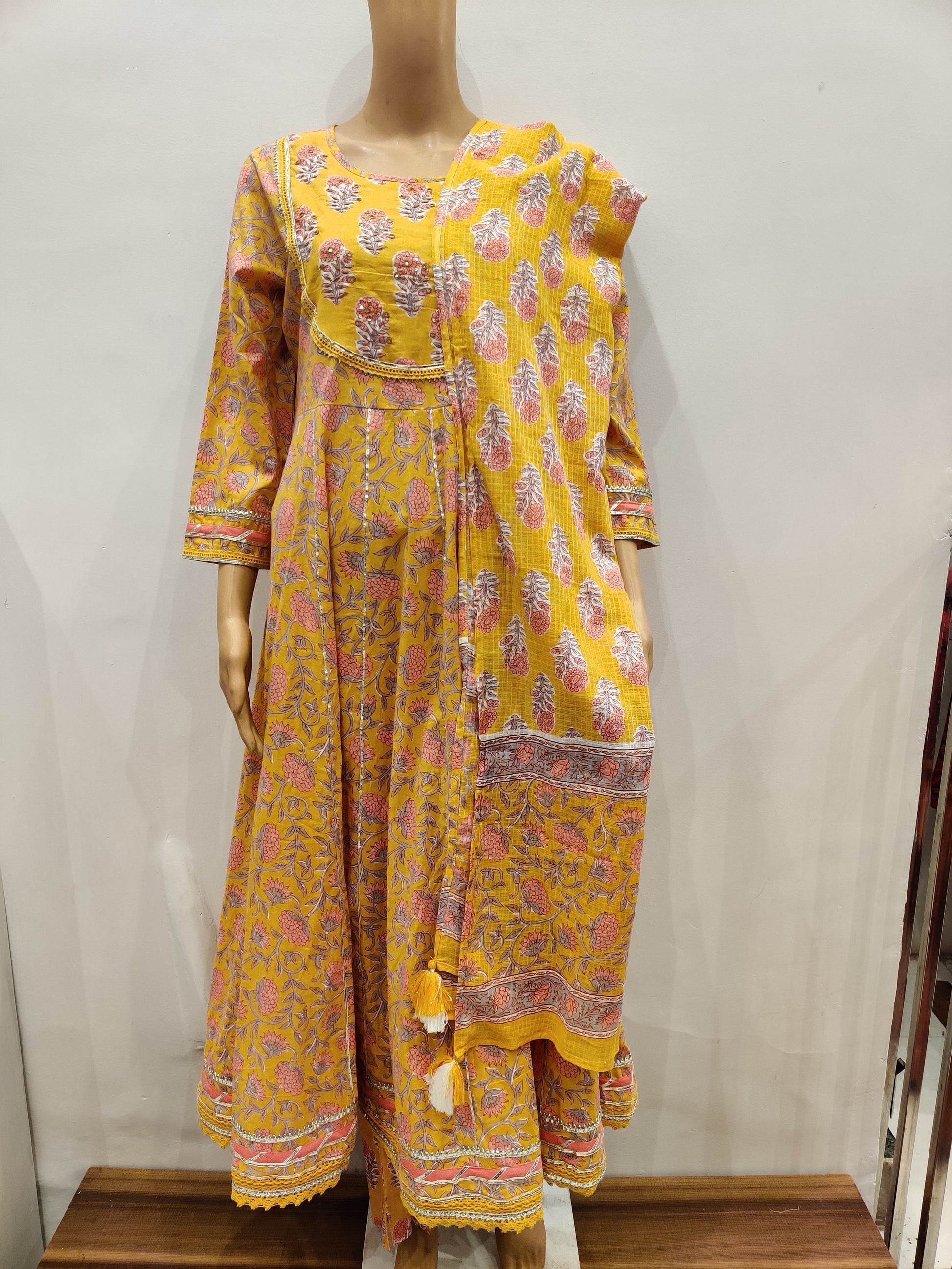 This exquisite ensemble weaves together tradition and contemporary flair. The rich green fabric of the Kurti is adorned with intricate floral patterns, offering a visual feast of vibrant colors and detailed designs. Meticulously woven, the material ensures both comfort and style. The complementary pants echo the Kurti’s elegance, while the dupatta adds an element of grace. This attire transcends mere clothing—it’s a piece of artistry.