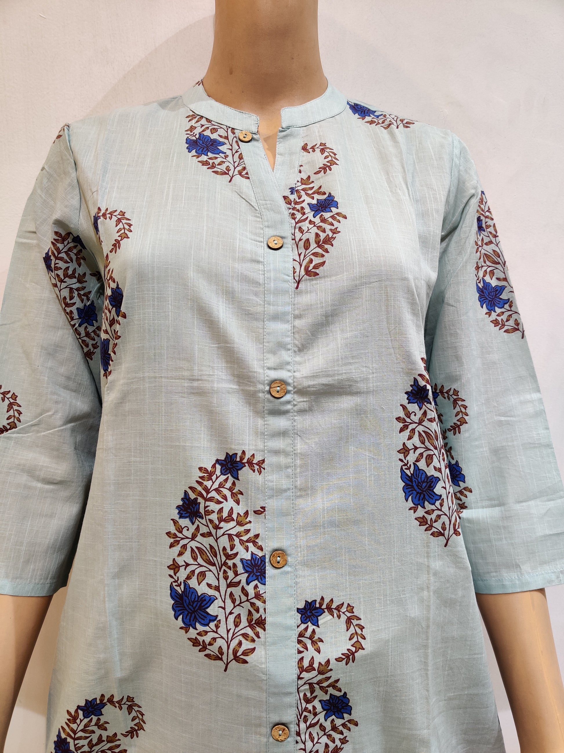 This elegant Kurti is crafted from a soft, breathable Pure Cotton that ensures comfort and durability. The material showcases a subtle sheen, enhancing the light grey base colour of the Kurti. Adorned with intricate dark block paint, it creates a beautiful contrast, making the attire elegant and visually appealing. The Kurti features 3/4th sleeves and reaches till below the knees, offering both style and modesty.