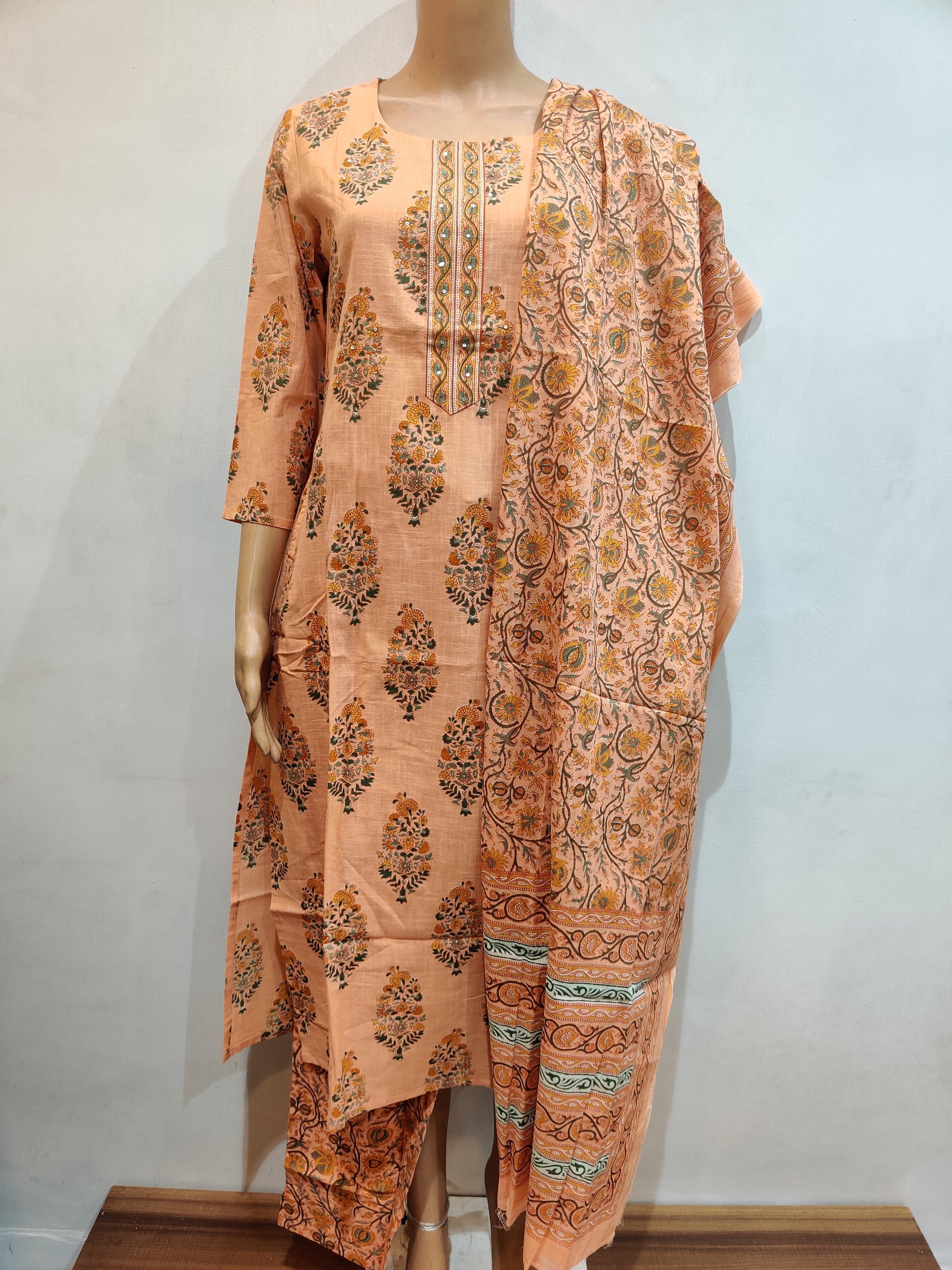 The kurta-pant-dupatta is crafted from finely woven fabric adorned with delicate, intricate patterns created through traditional block printing or hand embroidery techniques. The warm terra cotta tones and elegant motifs suggest the textiles were carefully dyed and decorated by skilled artisans using time-honored methods passed down through generations, preserving the rich cultural heritage and artistry of the region from which this ensemble originates.