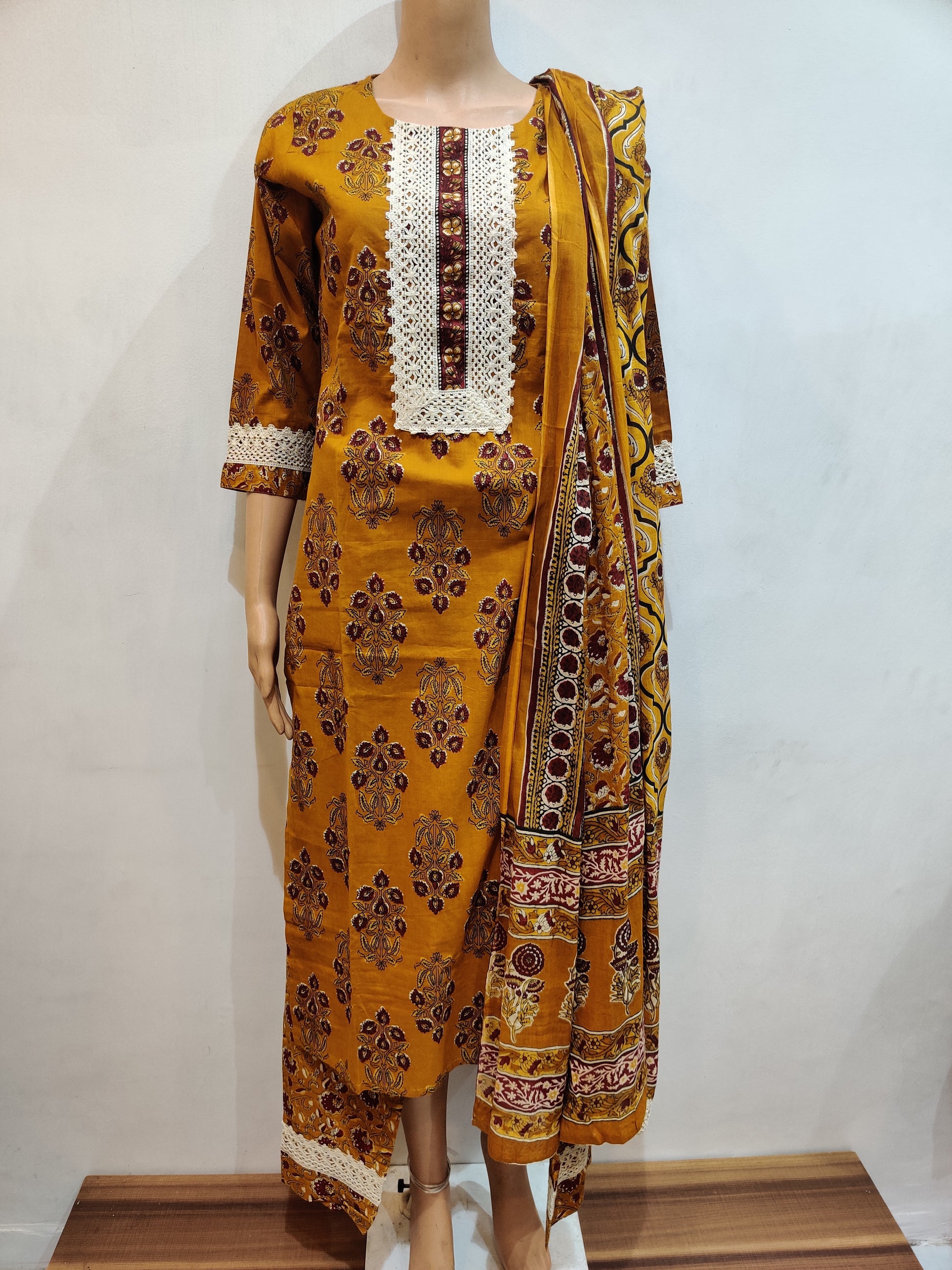 The block printing technique involves carefully carving intricate patterns onto wooden blocks and meticulously stamping them onto the fabric using natural dyes. This age-old craft, passed down through generations, lends incredible depth and character to the textile. The embroidered neckline and borders further elevate the artisanal quality of this elegant ensemble, reflecting the skilled handiwork of master artisans dedicated to preserving India's textile heritage.