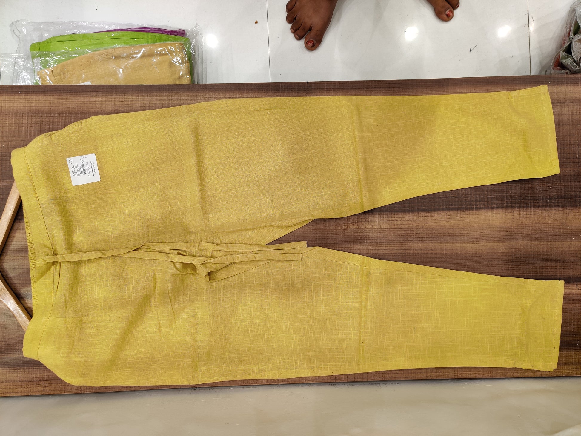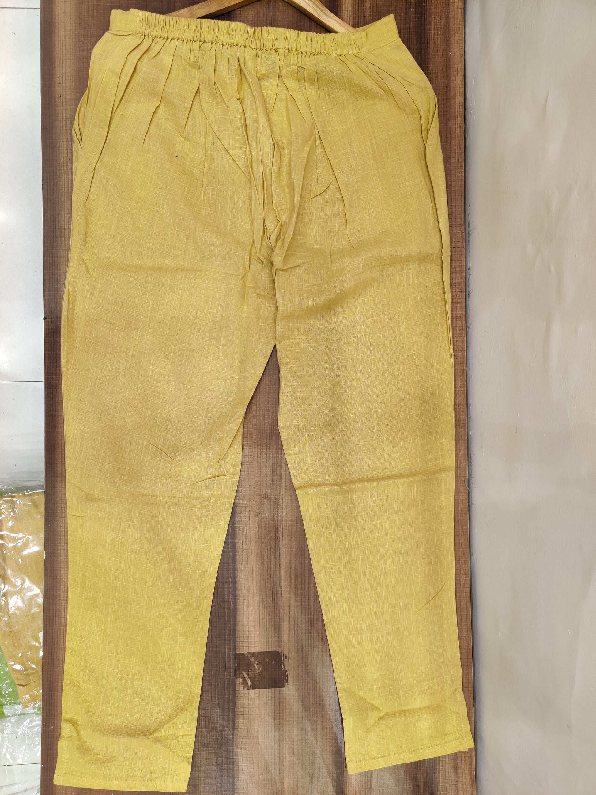 The product is a pair of casual pants made from a lightweight, breathable cotton fabric. The pants feature a relaxed, straight-leg silhouette in a versatile tan or beige shade. The fabric has a subtle textured weave pattern that adds depth and visual interest to the design. These comfortable cotton pants are perfect for everyday wear, offering a laidback yet polished look suitable for various casual settings.