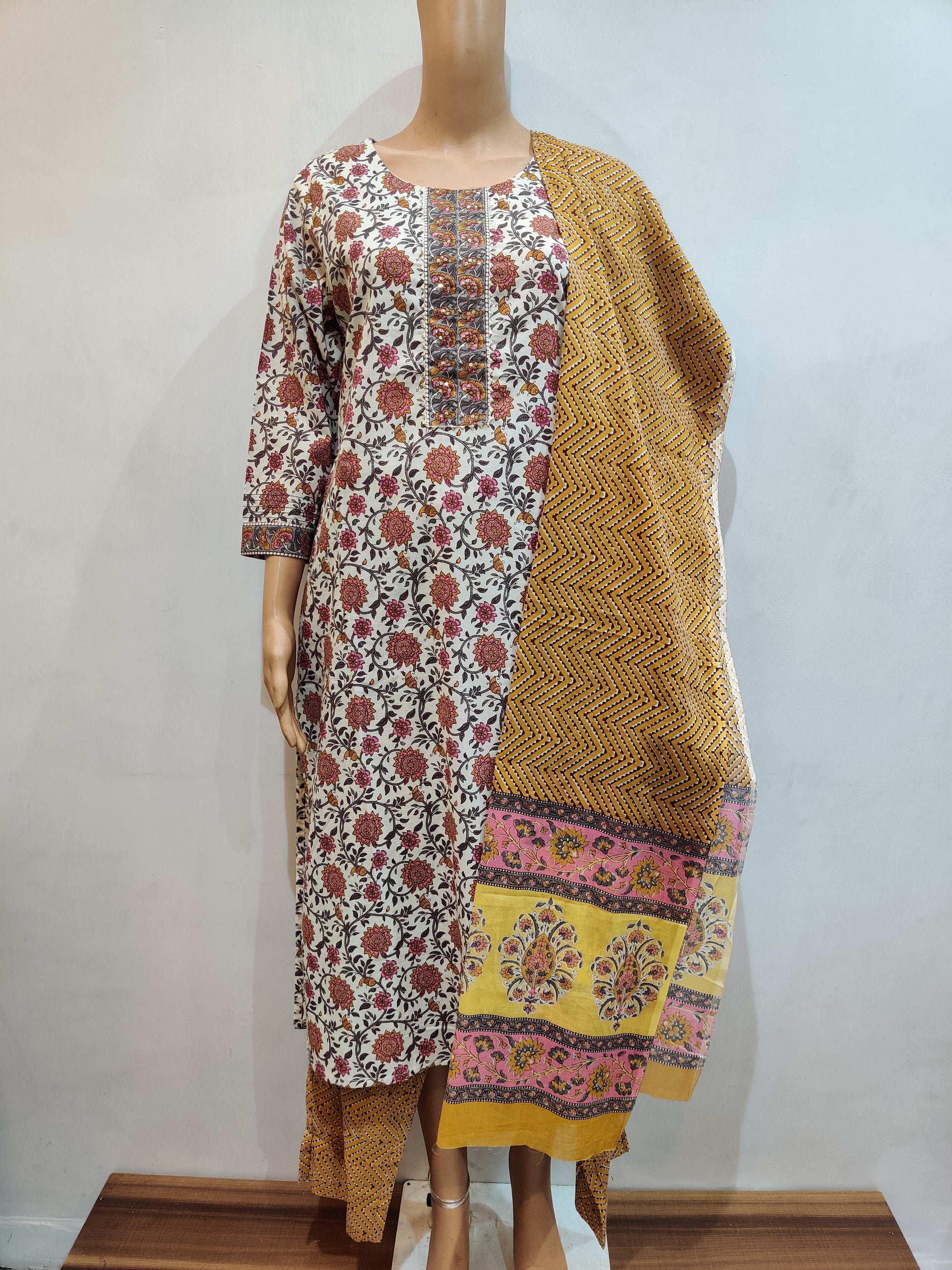 The ensemble exudes a timeless charm, with the earthy tones and delicate patterns lending an elegant and understated appeal. The dupatta adds a versatile layering option, allowing for various styling possibilities while maintaining a cohesive and graceful look.
