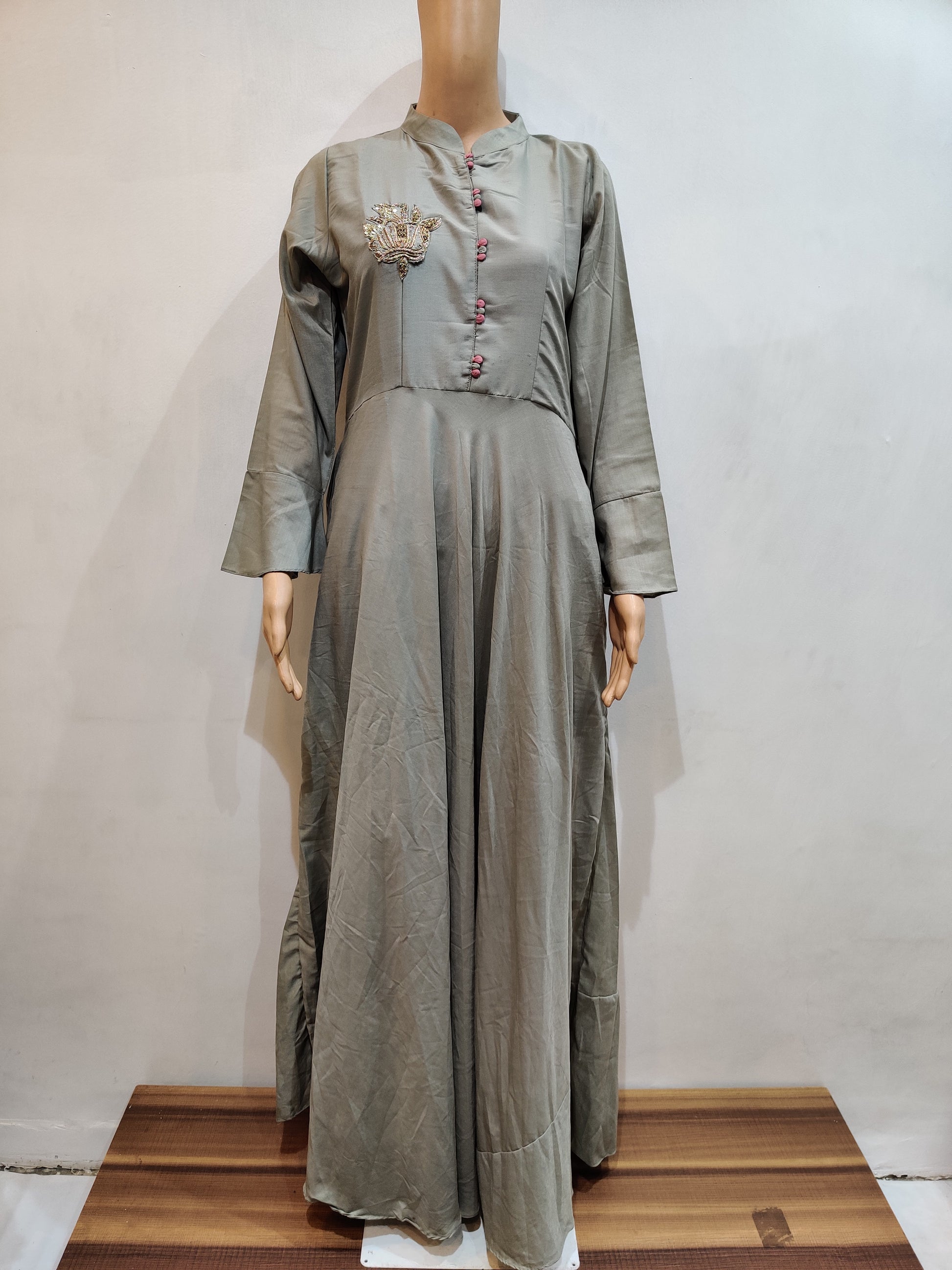 A long, flowing dress in a soft gray color. It is made of a lightweight, draped Muslin fabric that falls elegantly to the floor. The dress has a simple yet elegant design with long sleeves and a subtle stripe pattern running through the textile. A versatile and timeless gray maxi dress suitable for various occasions, made of breathable, high-quality fabric that drapes beautifully on the form.