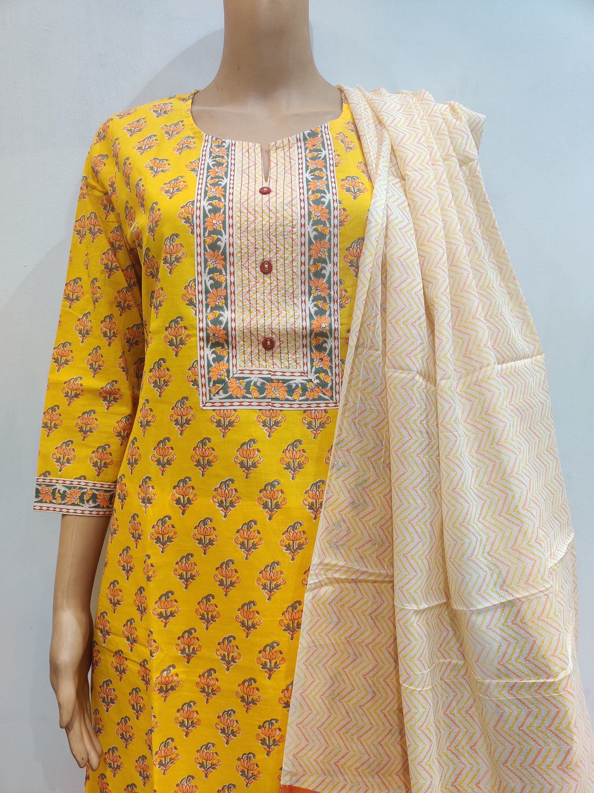 The kurti pant with dupatta ensemble featured in the image showcases a vibrant yellow hue, injecting a cheerful and lively element into your wardrobe. Crafted from a soft and breathable fabric, this set prioritizes comfort and durability, ensuring that you stay at ease throughout the day. The kurti pant displays intricate patterns that enhance its visual appeal, while the contrasting white dupatta elegantly complements the yellow kurti, making it a versatile choice suitable for various occasions. This ensemble seamlessly combines style, comfort, and elegance, making it a standout addition to your ethnic wear collection.