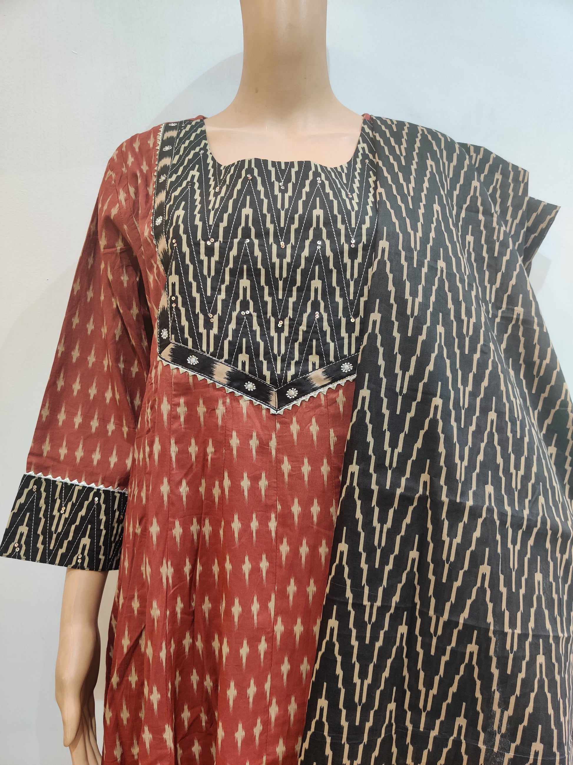 This kurti pant dupatta set is a stunning blend of traditional charm and contemporary design. The vibrant red base of the kurti adorned with intricate white patterns creates a captivating look, while the soft and breathable fabric ensures comfort and durability throughout the day. The white square-like patterns on both the kurti and pant are elegantly complemented by the black base and white zigzag lines on the dupatta, adding a contrasting yet harmonious touch to the ensemble. The kurti's three-quarter sleeves with black fabric edging, mirroring the dupatta's white zigzag pattern, contribute to the set's overall cohesion and beauty.