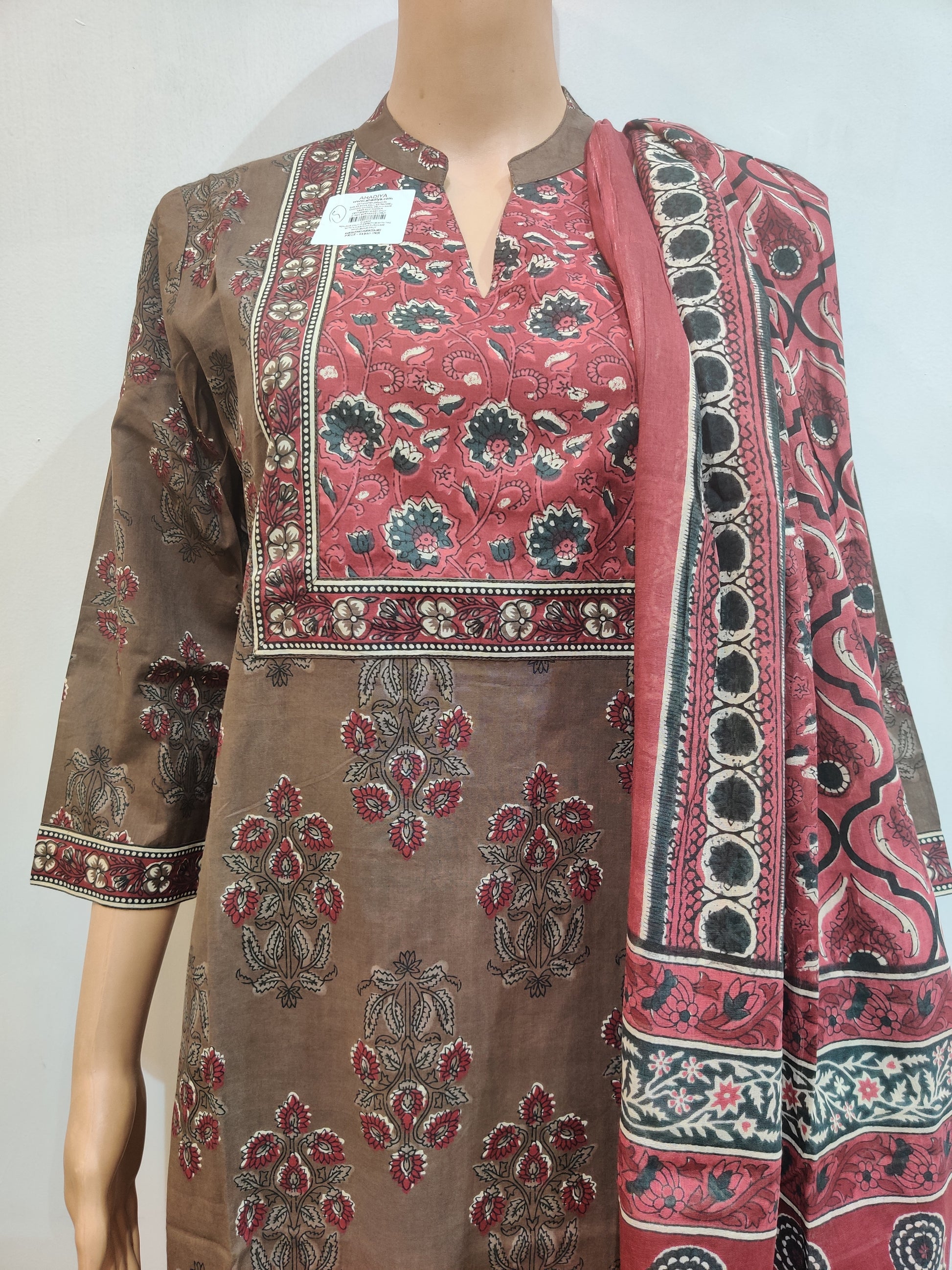 This kurti pant dupatta set in a rich maroon hue is a true embodiment of elegance and grace. Crafted from luxurious, soft fabric, it not only ensures comfort but also offers breathability, making it perfect for long hours of wear. The intricate patterns, blending traditional motifs with a modern twist, create a unique and eye-catching aesthetic that sets this ensemble apart.
