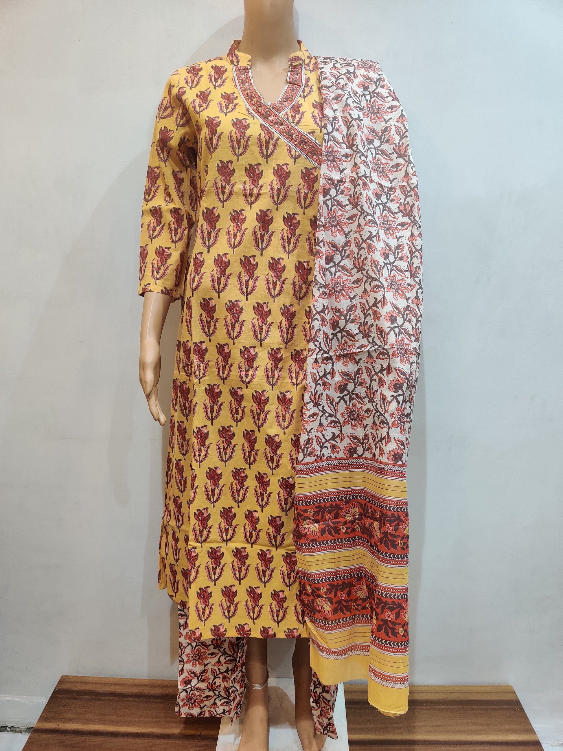 A long kurta made from a lightweight chiffon or georgette fabric. The dress features two distinct patterns - one half displays an intricate golden motif or batik design on a warm camel base, while the other half has a delicate floral pattern in shades of lavender and pale pink over a light background.