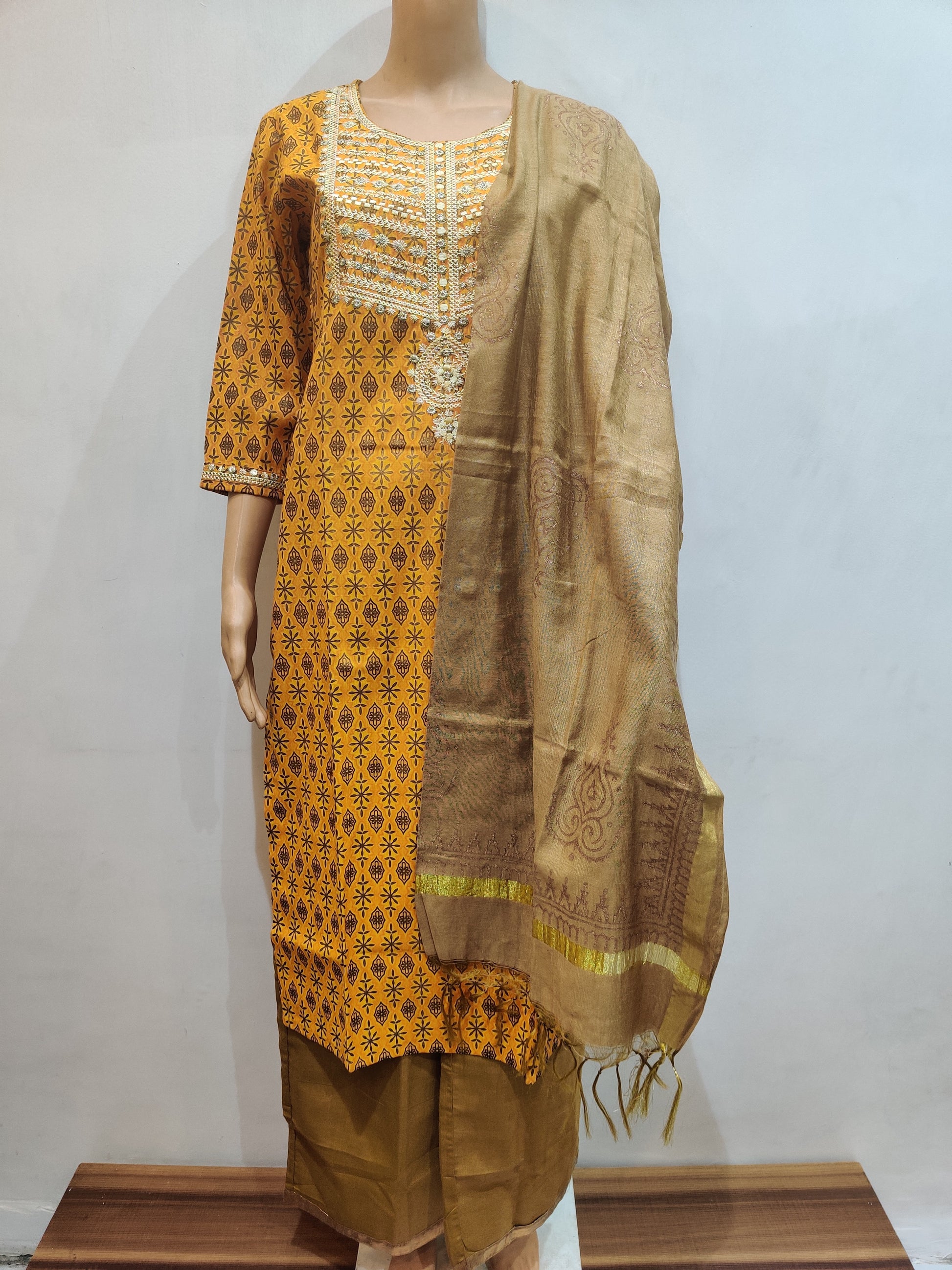 Step into a world of vibrant elegance with our mustard yellow kurta pant dupatta set, a harmonious fusion of color, material, and intricate patterns. Crafted from high-quality fabric, this set promises both comfort and durability, ensuring a seamless experience with every wear. The kurta, adorned with detailed white patterns, exudes a traditional charm that's accentuated by its three-quarter sleeves and below-the-knee length. Paired with plain mustard yellow pants, the kurta takes center stage, showcasing its elegant design. The translucent golden-hued dupatta, featuring delicate embroidery along the borders, adds a touch of grace and sophistication to the ensemble. This set is a celebration of meticulous craftsmanship and style, perfect for those who appreciate the beauty of traditional motifs in a modern context.
