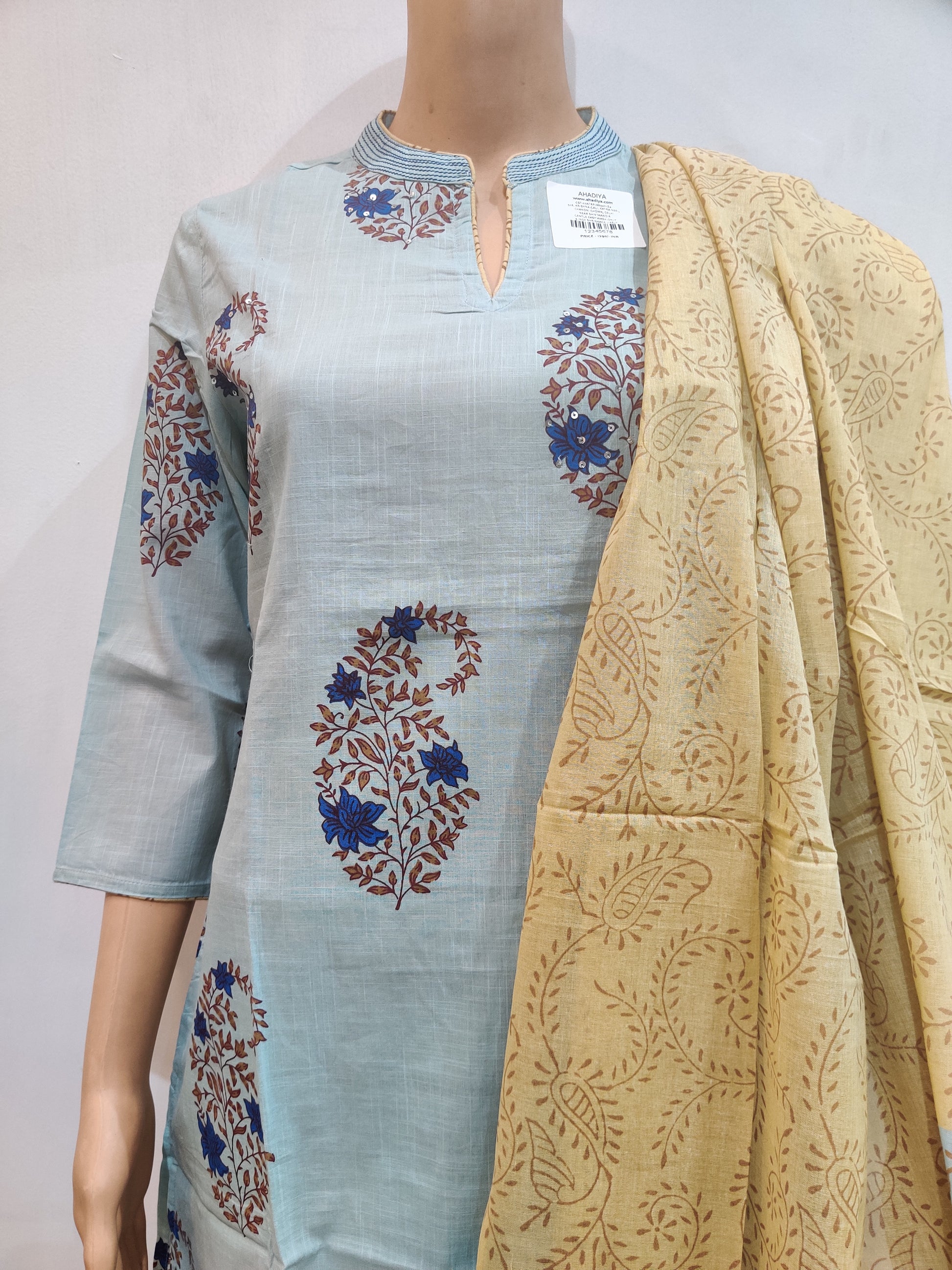 Immerse yourself in understated elegance with our serene light-colored kurta pant dupatta set, where intricate designs meet a tranquil base to create a captivating ensemble. Crafted from a soft, breathable fabric, this set ensures a comfortable and durable wearing experience. The kurta's dark-colored patterns, artistically scattered across the fabric, add a touch of sophistication and allure. Paired with solid-colored pants that harmonize seamlessly with the kurta's detailed design, the set offers a balanced and visually appealing look. The vibrant yellow dupatta drapes gracefully, providing a striking contrast and a touch of refinement to the overall outfit. This kurta pant dupatta set is perfect for those who appreciate the beauty of meticulous craftsmanship and seek elegance in every detail.
