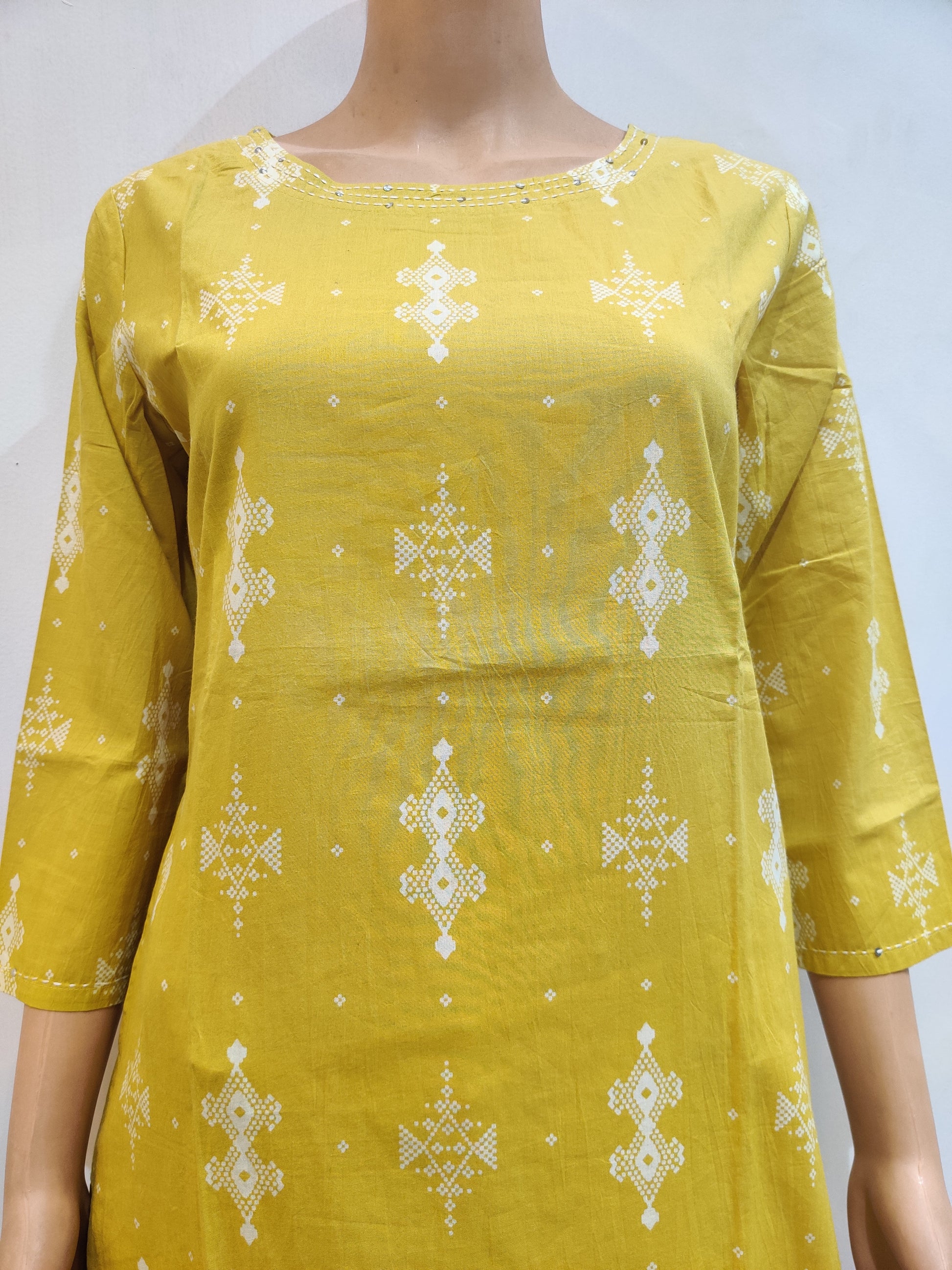 The kurti (tunic) appears to be made from a light, breathable fabric like cotton or cotton-blend material, lending a soft, flowy drape to the design. The pattern is intricate yet understated, adding a touch of femininity and visual interest.