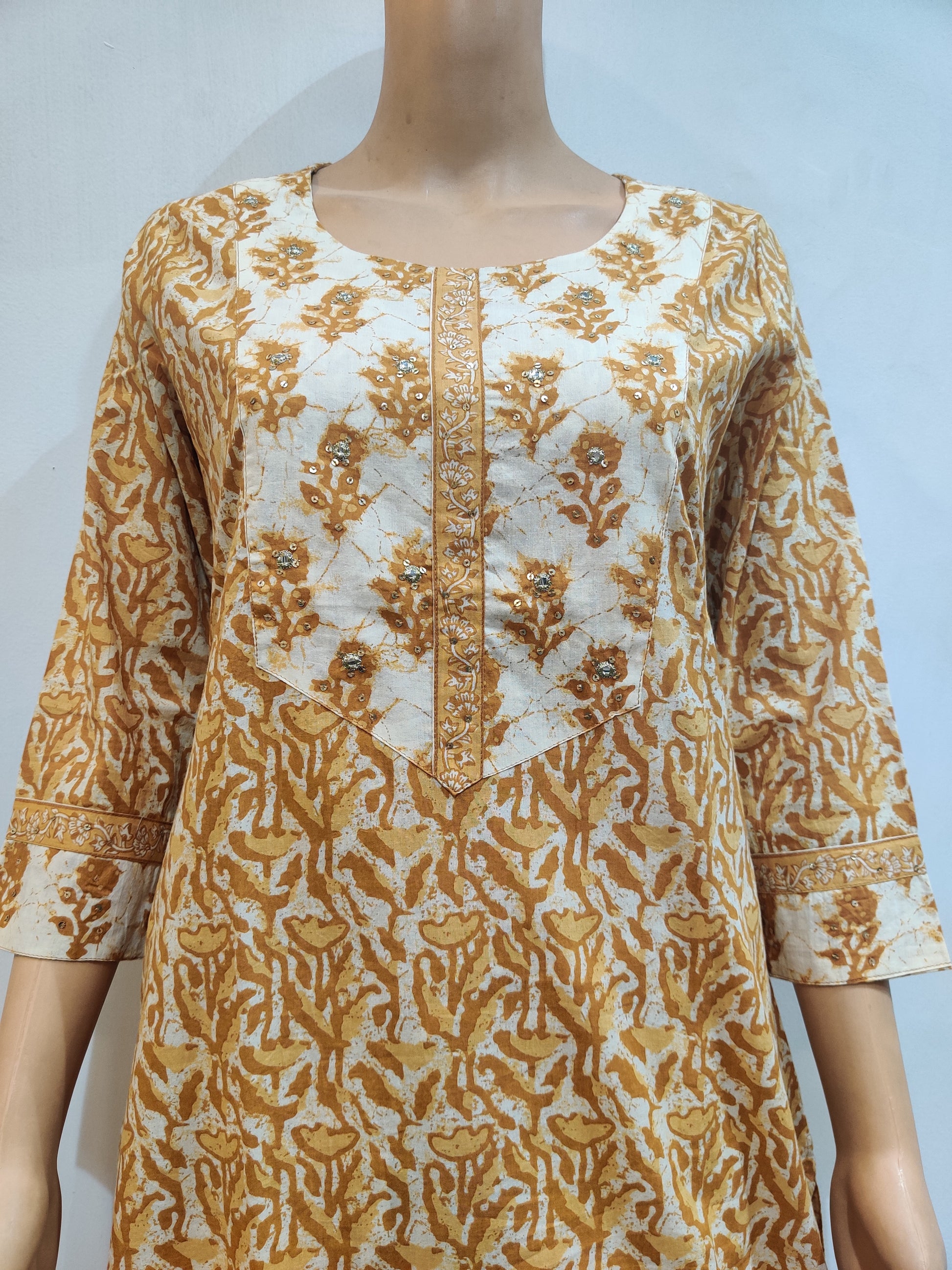An elegant kurti pant set featuring an intricate allover print in soft, earthy tones of beige and brown.