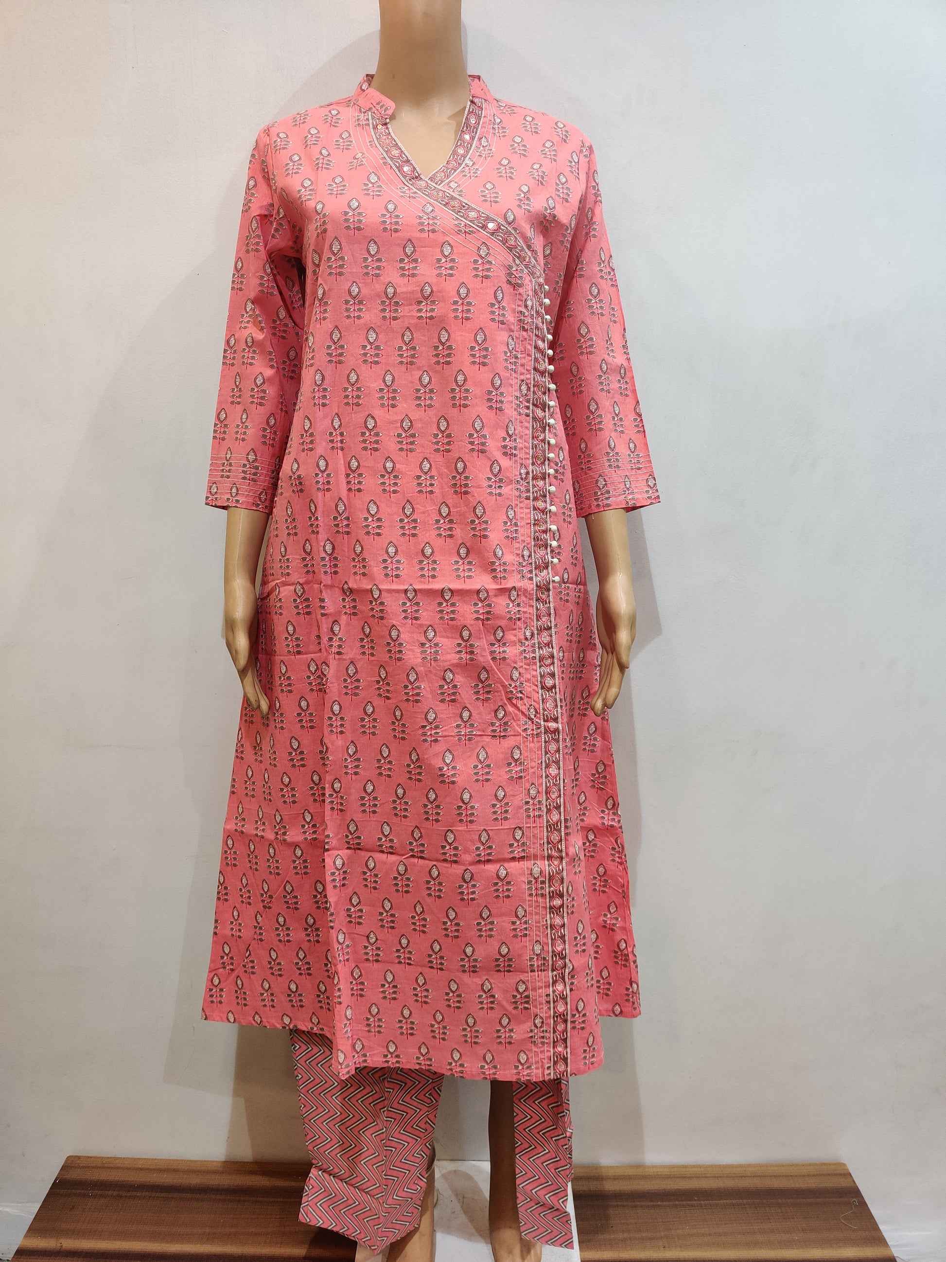 This pink kurta pant set features a graceful shade that adds a soft and elegant touch to the outfit. Crafted from premium quality fabric, it promises both comfort and durability, ensuring ease of wear for extended periods. The detailed pattern throughout the ensemble enhances its sophistication and visual appeal, making it stand out effortlessly. With dark blue cuffs on the kurta sleeves, matching buttons on the upper chest area, a modest round neckline, and coordinating pants in the same material, this set beautifully combines sophistication with comfort, making it a versatile choice for various occasions.