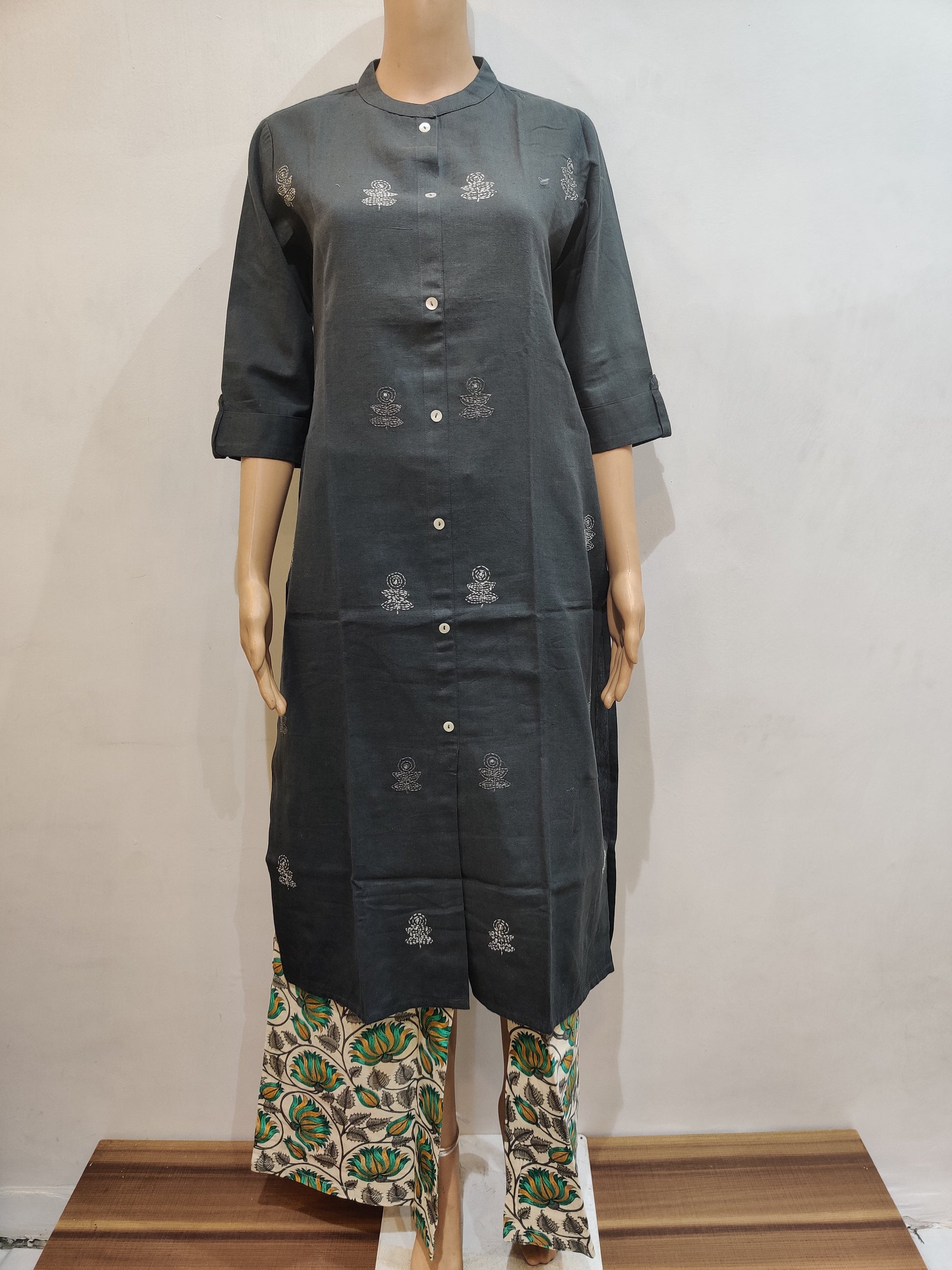 This elegant kurta pant set combines sophistication with comfort in a seamless blend. The kurta features a rich, dark shade that exudes an air of refinement, while the contrasting lighter, patterned design on the pant adds vibrancy to the ensemble.
