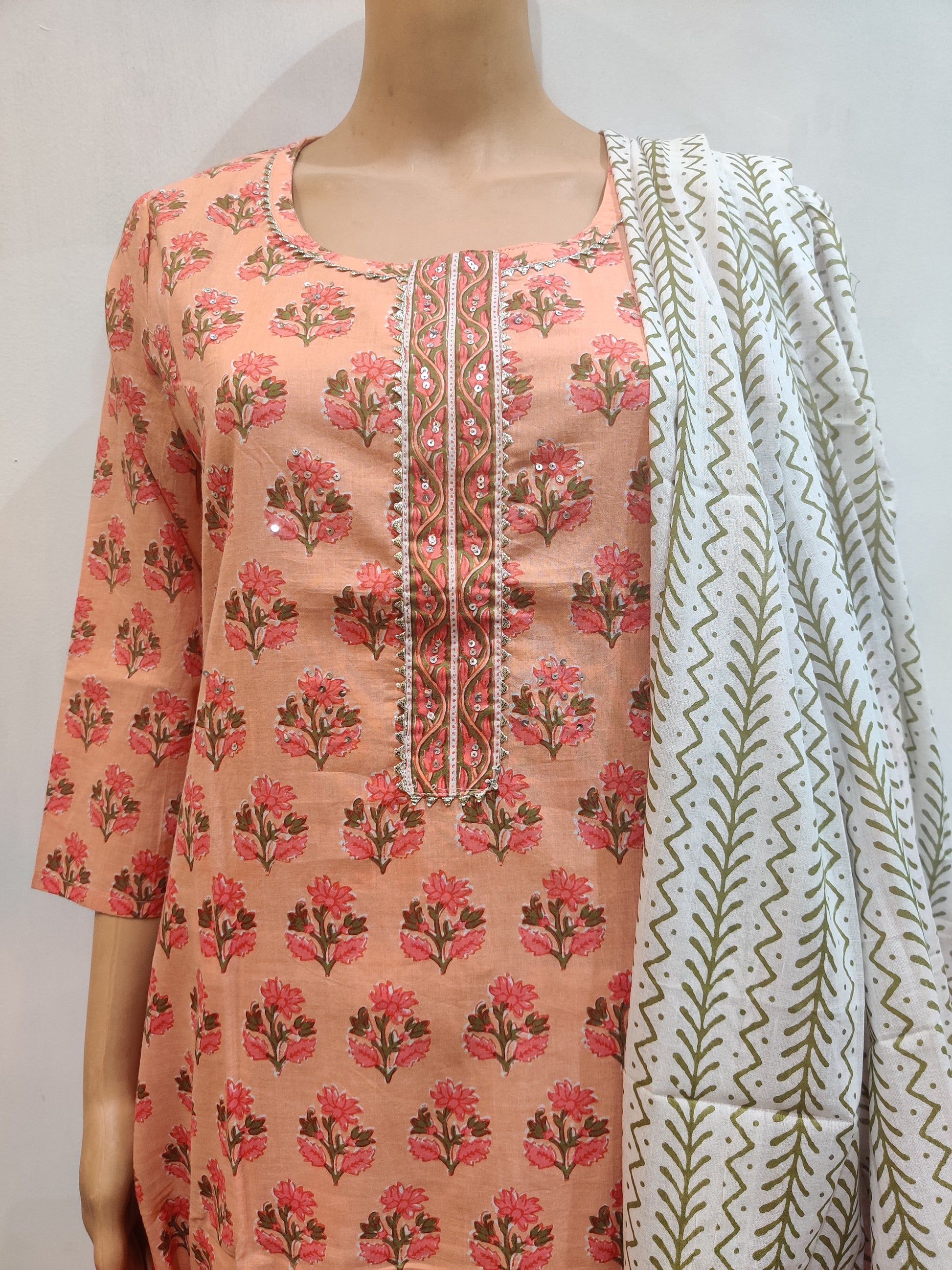 This kurta pant set presents a delightful blend of soft peach and grey tones, creating an aura of serenity and elegance. Crafted from premium quality fabric, both the kurta and pants offer a luxurious touch while ensuring exceptional comfort and durability. The material's graceful drape enhances the overall elegance of the attire, making it perfect for various occasions.