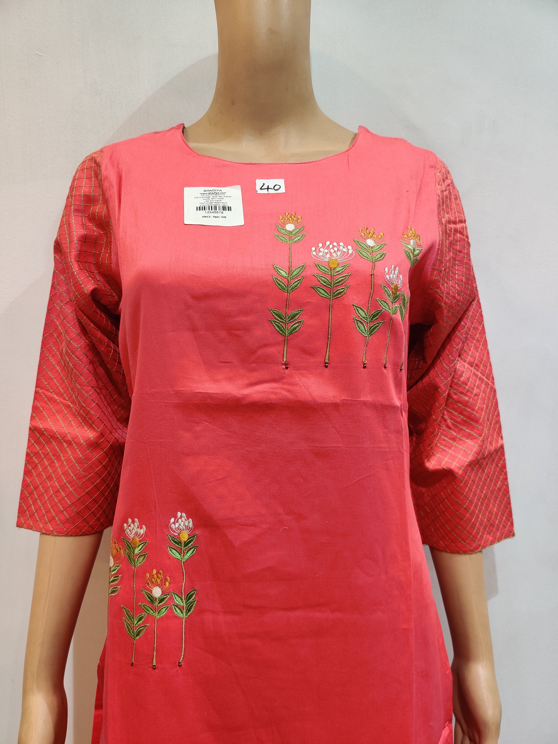 This dress exudes a delicate, feminine charm with its soft pink hue and floral embroidery. The lightweight Muslin fabric drape gracefully, creating a comfortable and flattering silhouette. The three-quarter length sleeves and knee-length hem offer a modest yet stylish look. The scattered floral motifs add a touch of whimsy and elegance to the overall design.
