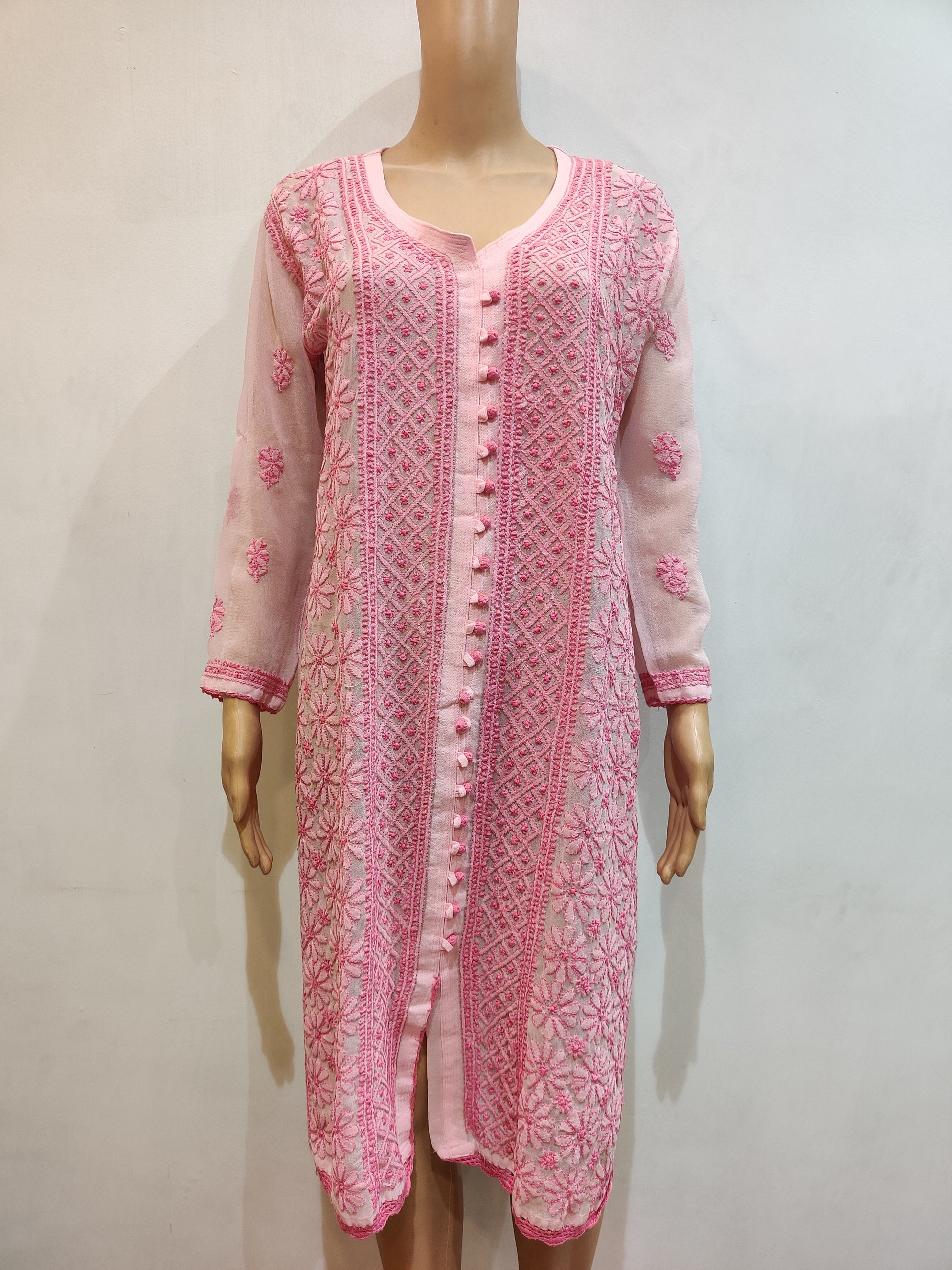 A soft pink hue that exudes a gentle and elegant aura, perfect for a feminine and charming look. It showcases intricate white embroidery, delicately adorning the entire outfit with a beautiful pattern that adds a touch of sophistication.
